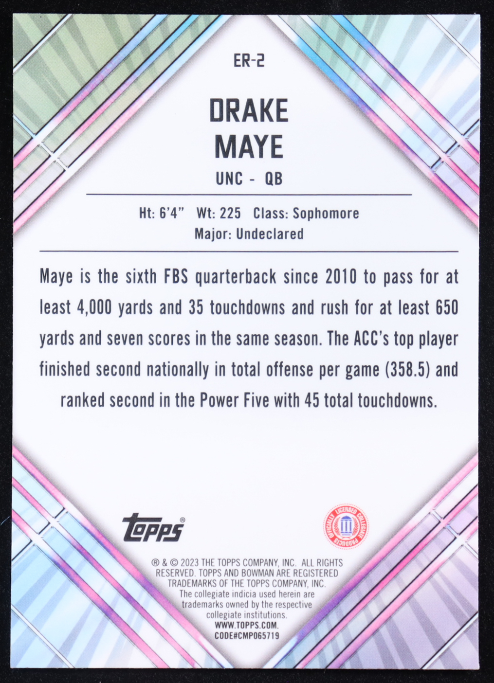 Drake Maye 2023 Bowman Chrome University Unexpected Delights Early Risers #ER2 RC