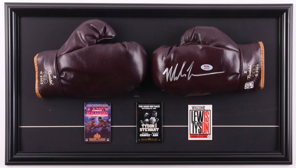 Custom frame measures 14" x 25" in size and features a set of (2) Everlast boxing gloves that have been hand-signed by Mike Tyson (HOF) and features a career statistics plaque. Please see photos for details regarding the condition of the item.