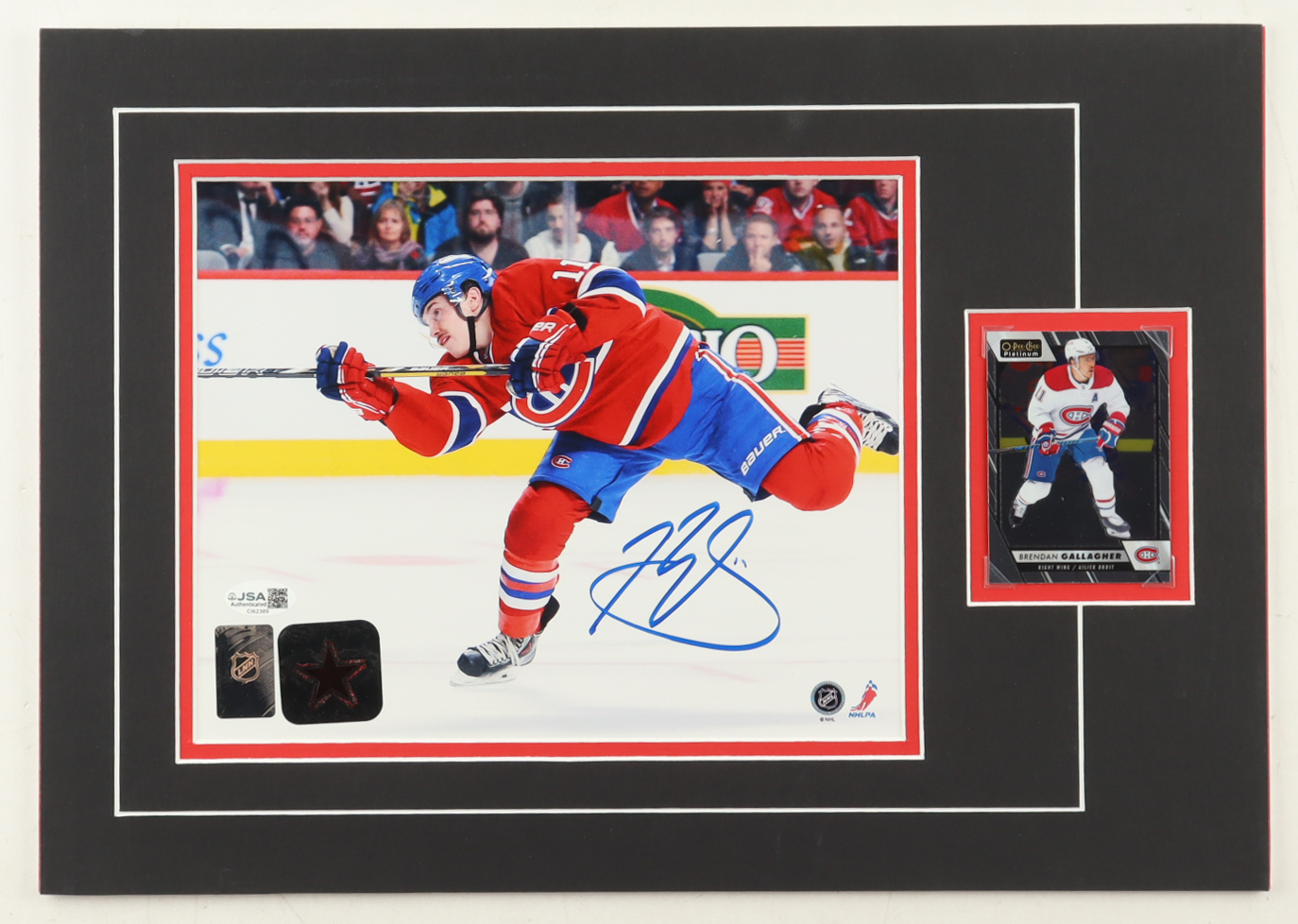 Custom display measures approximately 12" x 17" in size and features a photo that has been hand-signed by Brendan Gallagher (Montreal Canadiens). The display also features a Brendan Gallagher trading card.