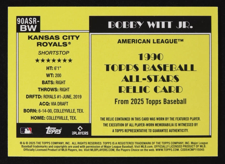 Bobby Witt Jr. 2025 Topps '90 Topps All Star Relics #90ASRBW