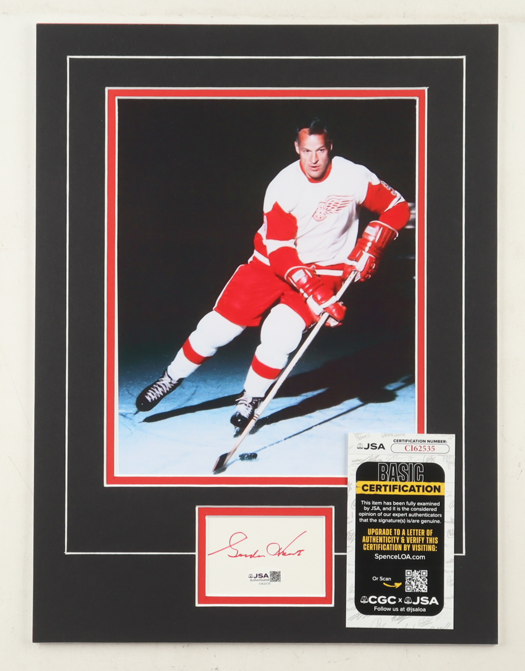 Custom display measures approximately 12" x 16" in size and features a cut that has been hand-signed by Gordie Howe (D. 2016, Detroit Red Wings, HOF). The display also features a 8" x 10" photo.