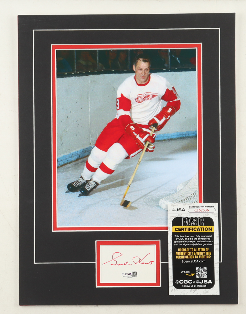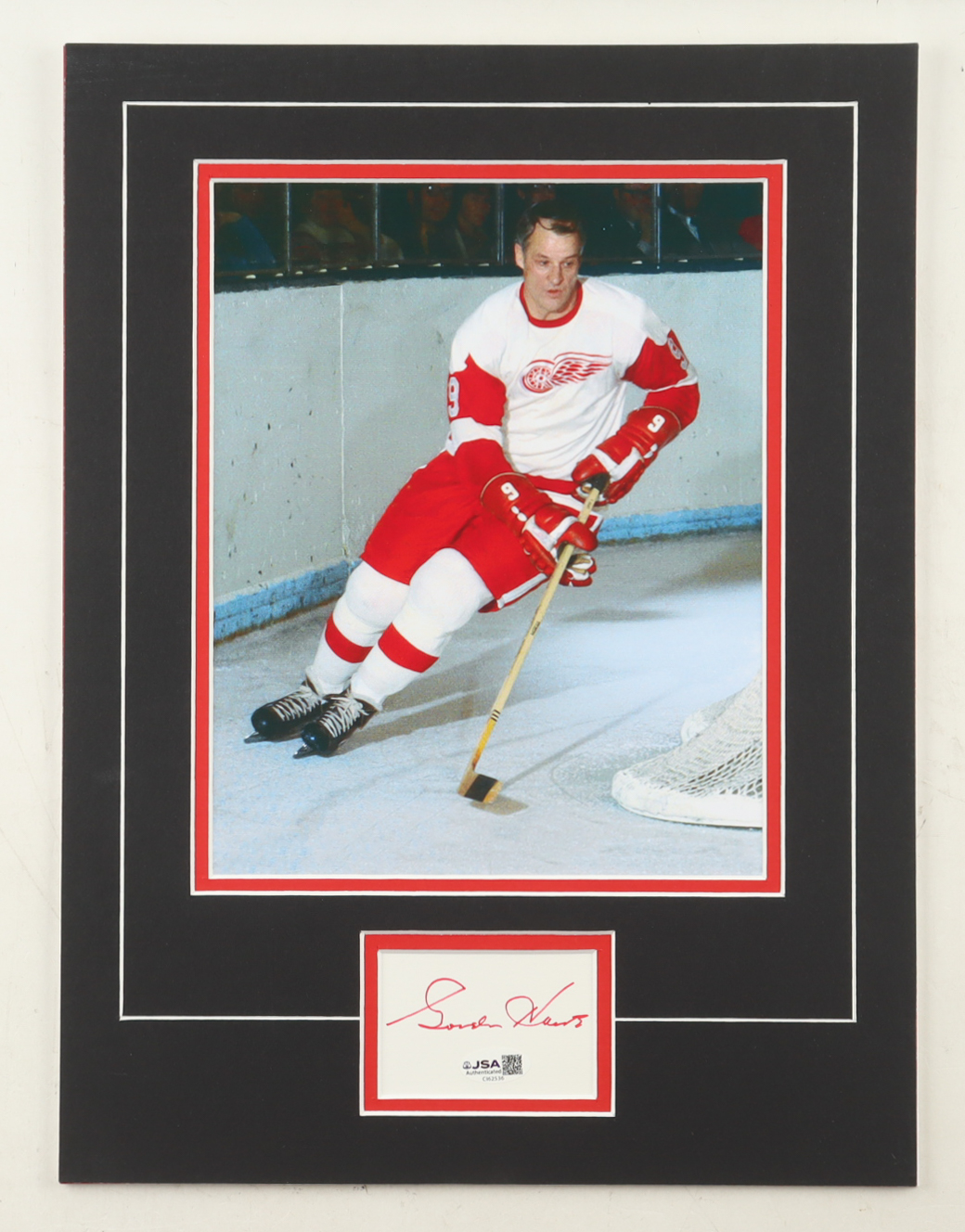 Custom display measures approximately 12" x 16" in size and features a cut that has been hand-signed by Gordie Howe (D. 2016, Detroit Red Wings, HOF). The display also features a 8" x 10" photo.