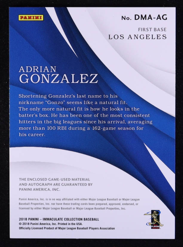 Adrian Gonzalez 2018 Immaculate Collection Immaculate Dual Material Autographs Blue #DMAAG #04/10