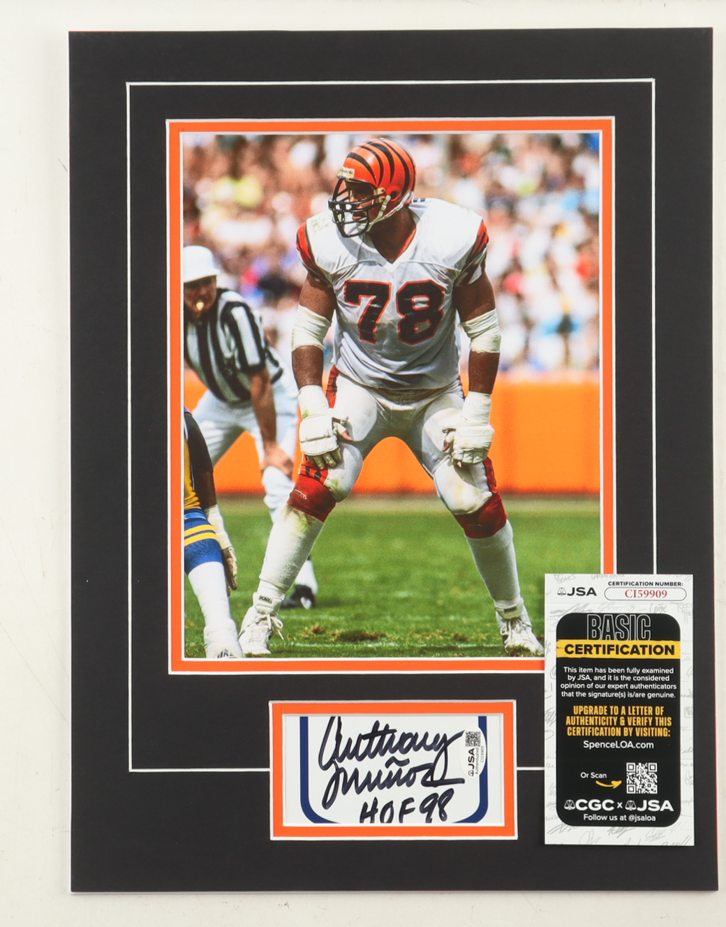 Custom display measures approximately 12" x 16" in size and features a cut that has been hand-signed and inscribed by Anthony Munoz (Cincinnati Bengals, HOF). The display also features a 8" x 10" photo.