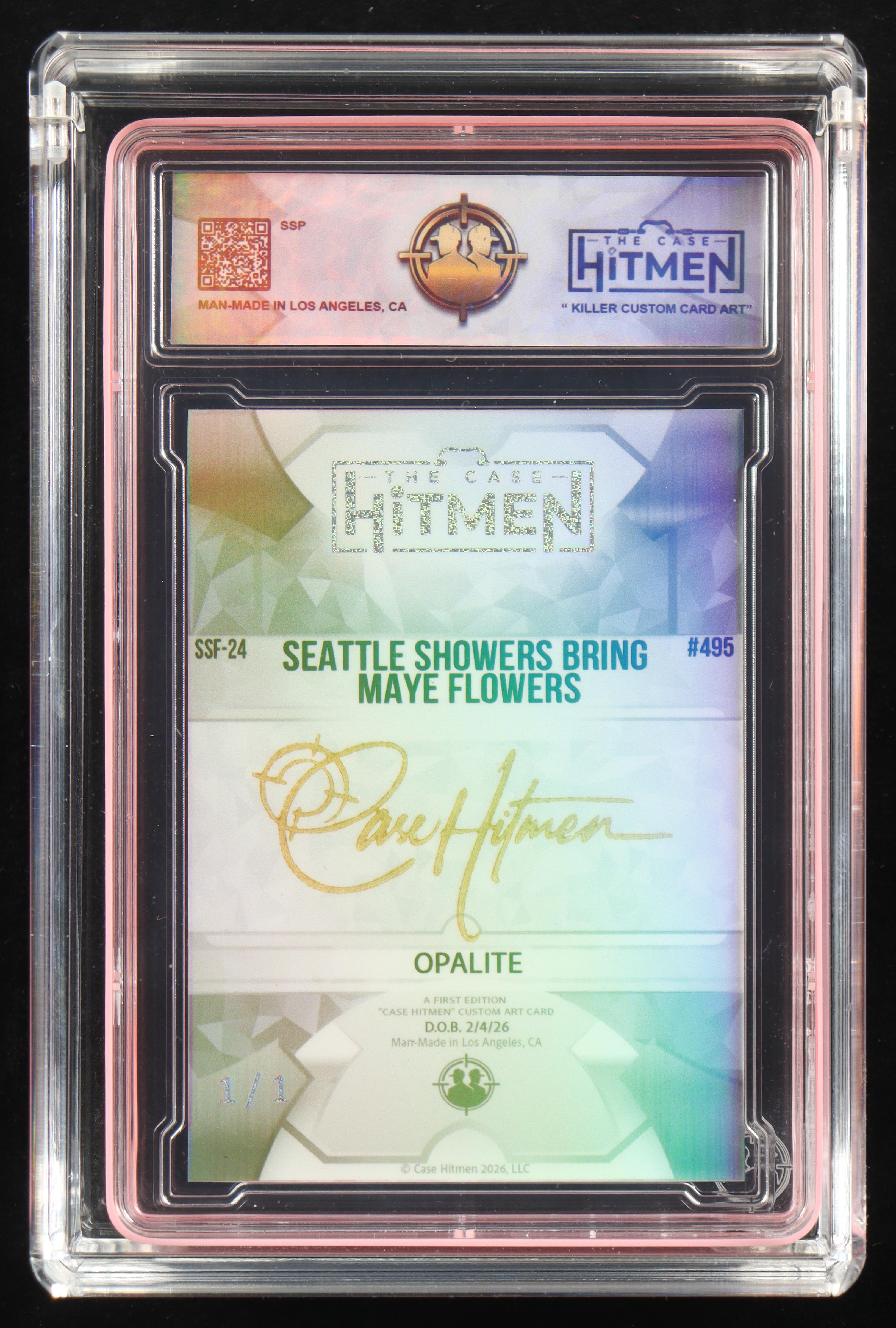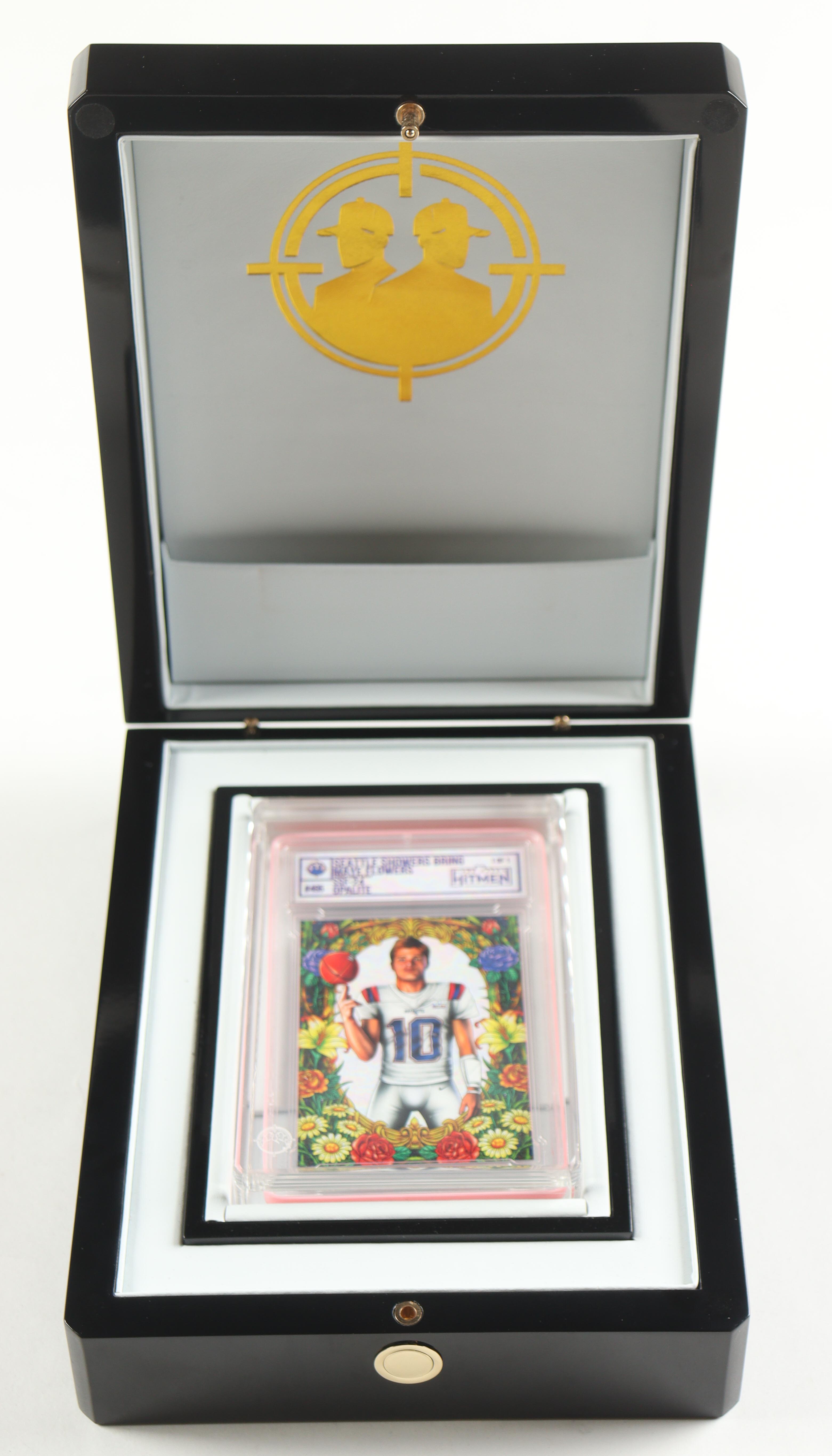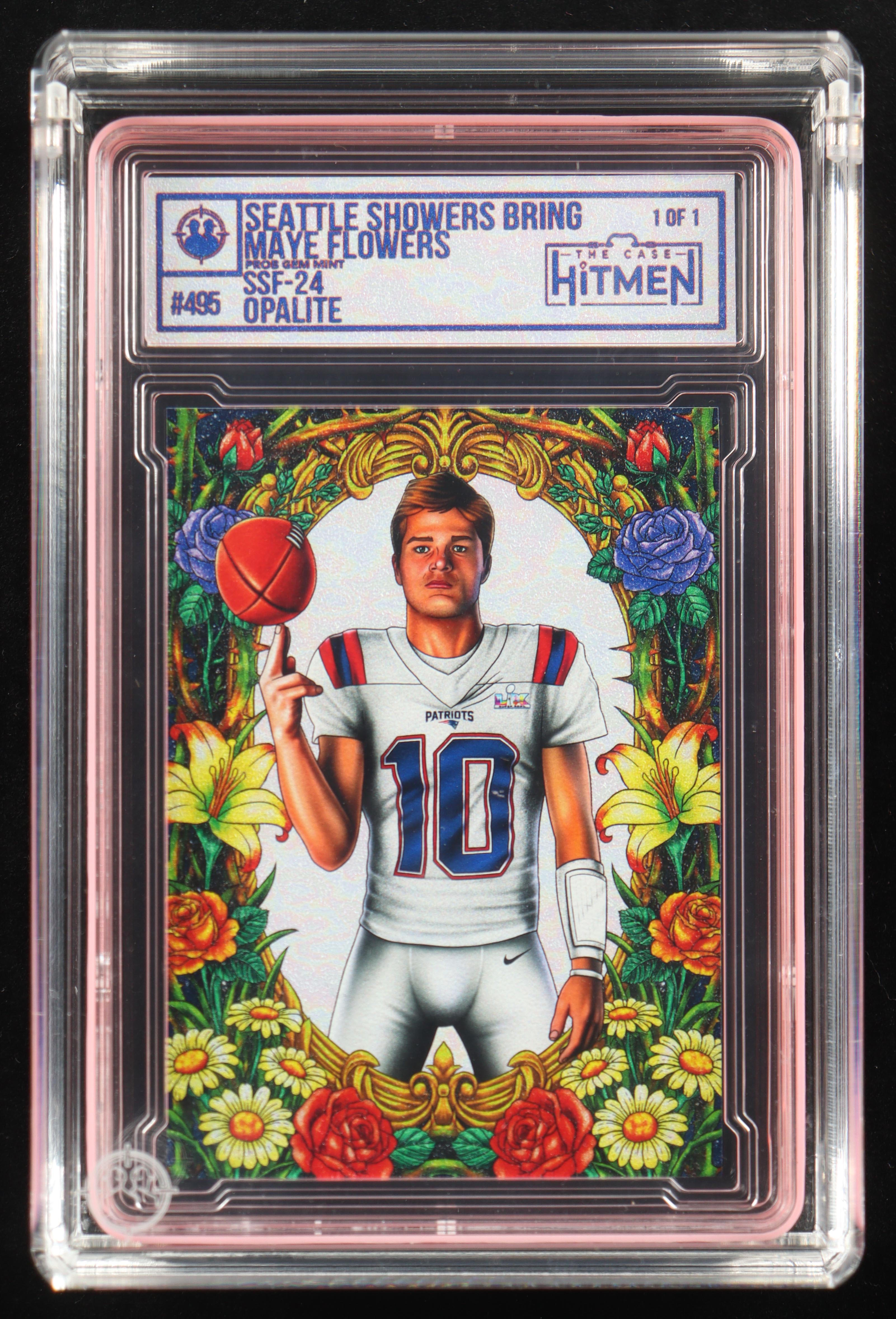 Drake Maye "Seattle Showers Bring Maye Flowers" The Case Hitmen Custom Art Card SSF-24 Opalite #495 #1/1 with (2) Custom Coins & Display Box