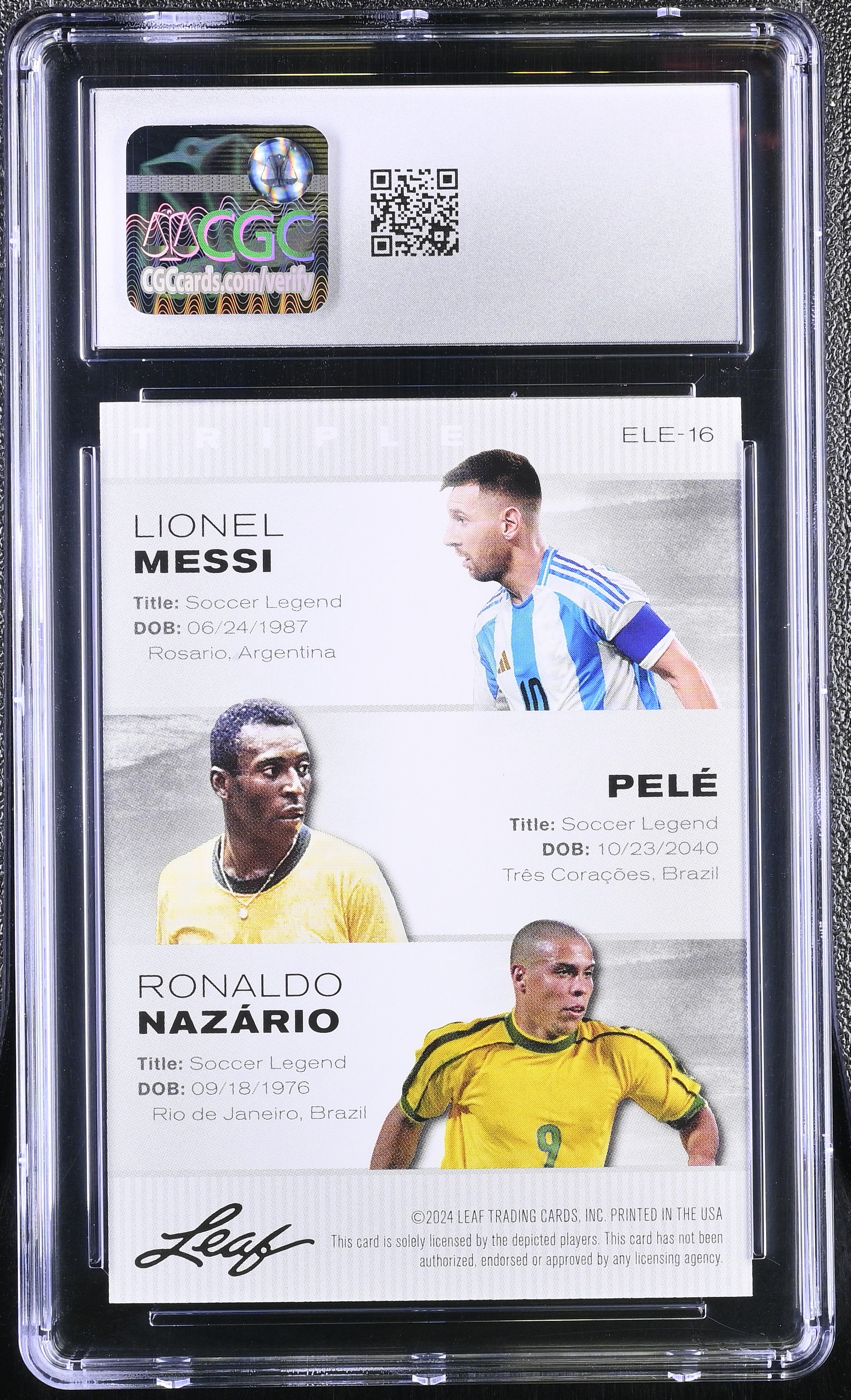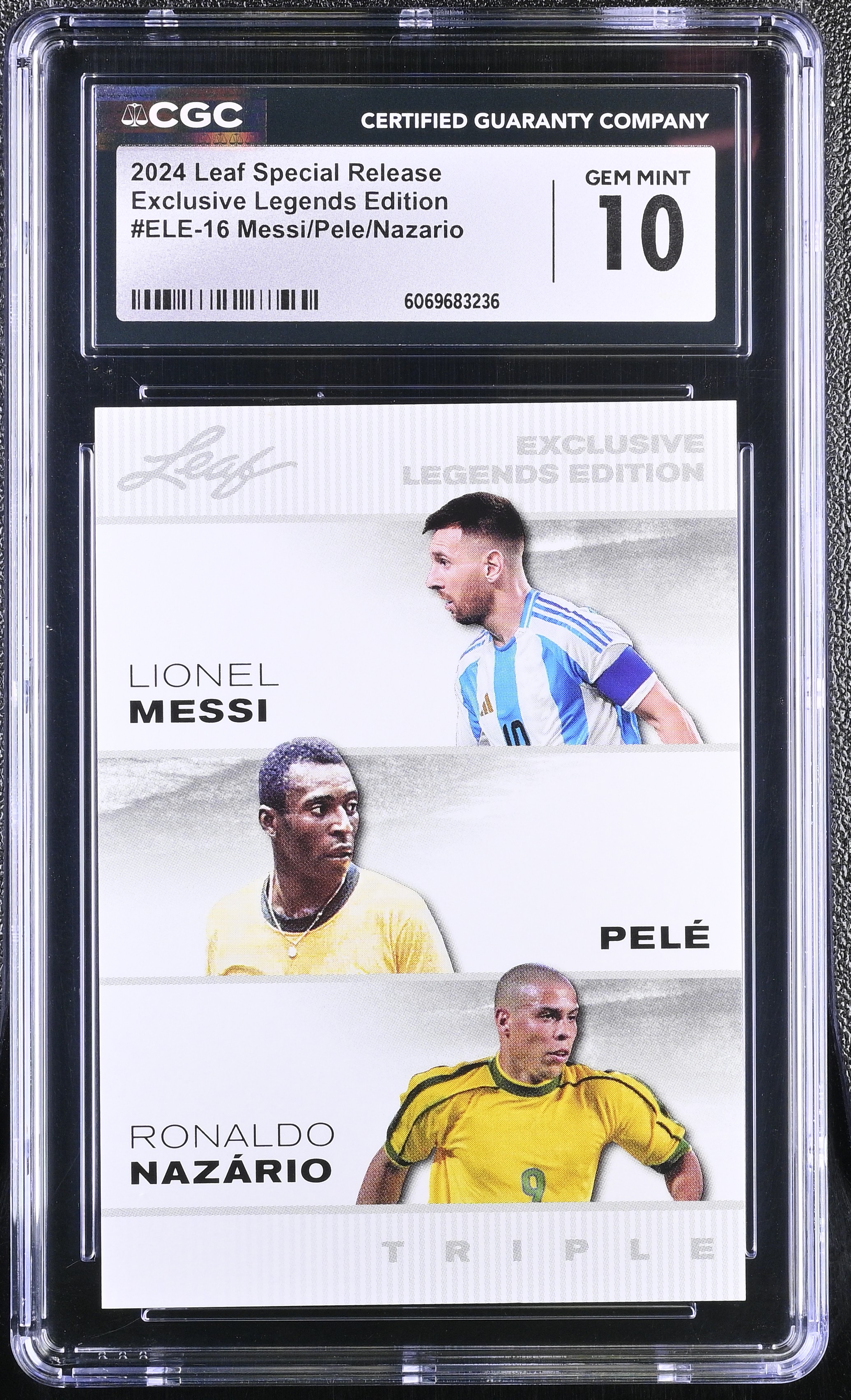 Lionel Messi/ Pele / Ronaldo Nazario 2024 Leaf Special Release Exclusive Legends Edition #ELE-16 (CGC 10)