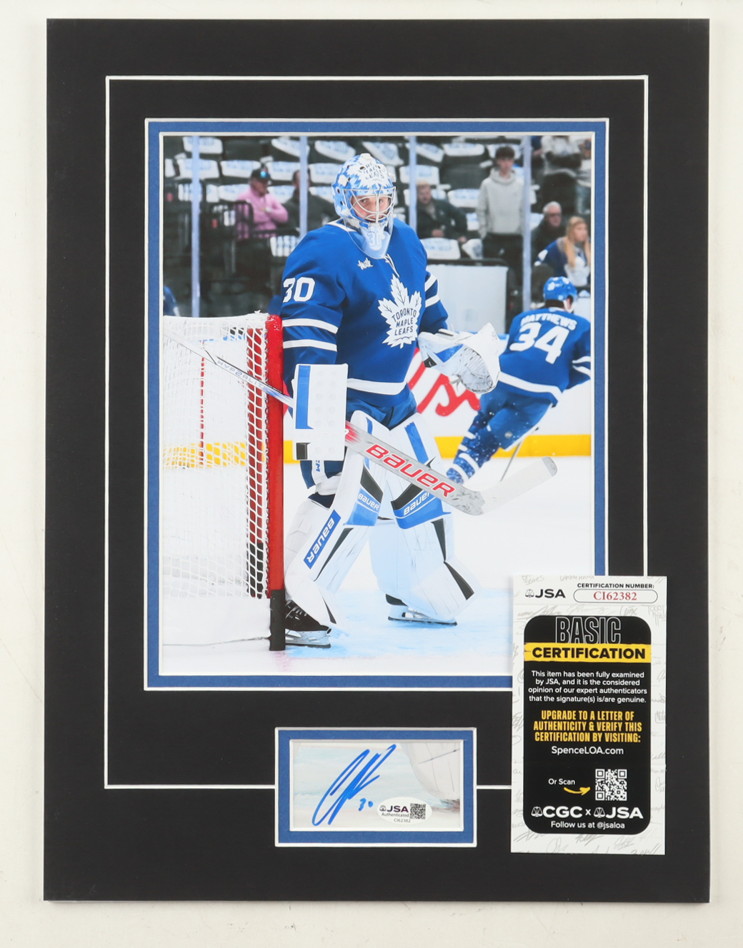 Custom display measures approximately 12" x 16" in size and features a cut that has been hand-signed by Cayden Primeau (Toronto Maple Leafs). The display also features a 8" x 10" photo.