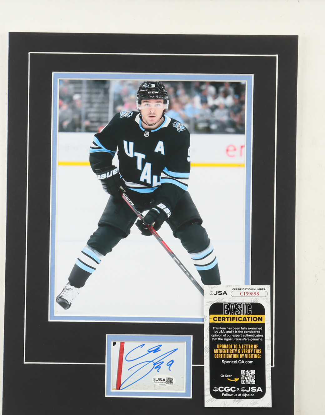 Custom display measures approximately 12" x 16" in size and features a cut that has been hand-signed by Clayton Keller (Utah Mammoth). The display also features a 8" x 10" photo.