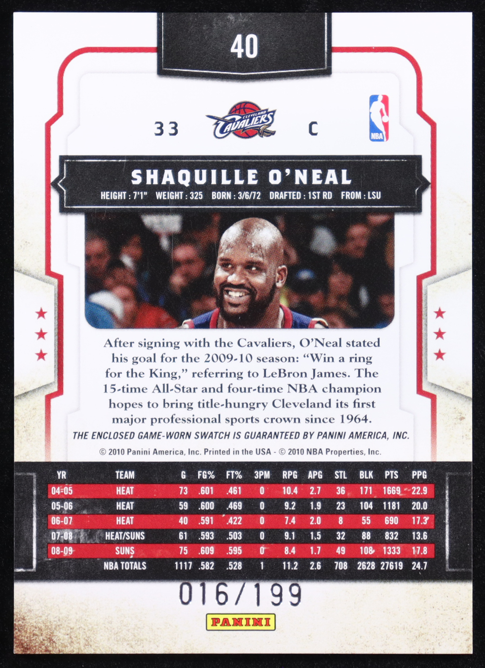 Shaquille O'Neal 2009-10 Classics Timeless Threads #40 #016/199