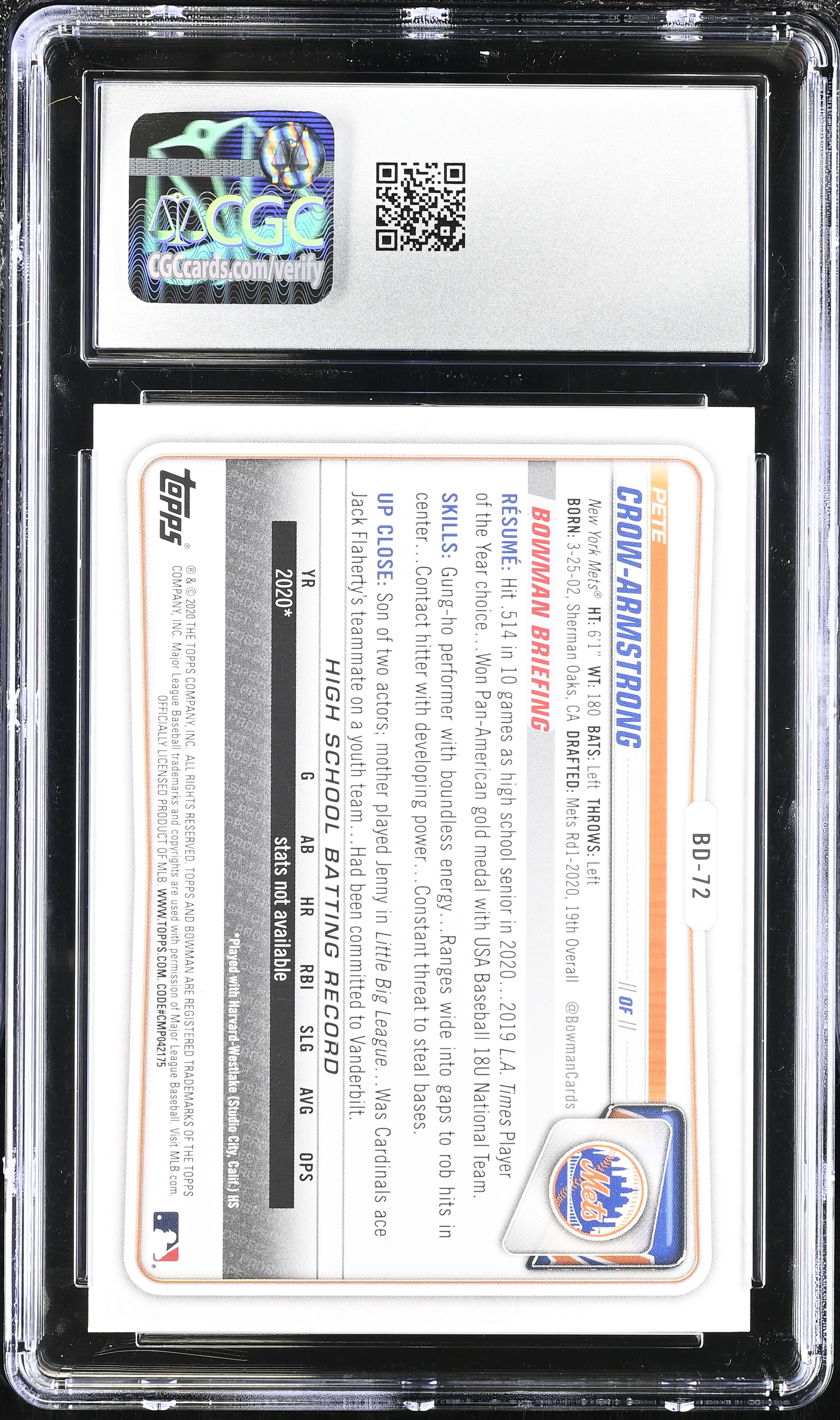 Pete Crow-Armstrong 2020 Bowman Draft #BD-72 RC (CGC 10)
