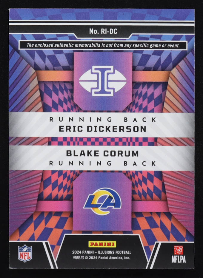 Eric Dickerson / Blake Corum (RC) 2024 Panini Illusions Rookie Idols Dual Memorabilia Red #9 #147/199