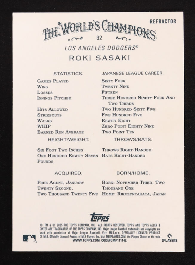 Roki Sasaki 2025 Topps Allen and Ginter Chrome Refractors #92 RC