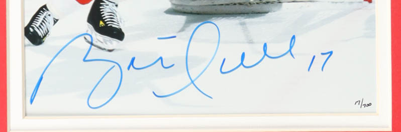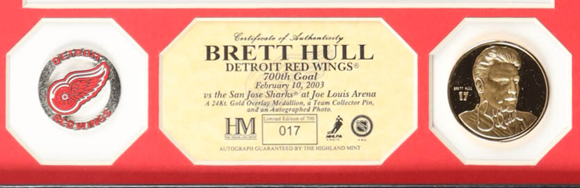 Custom frame measures approximately 13" x 16" in size. Photograph is hand-signed by Brett Hull (Detroit Red Wings, HOF).