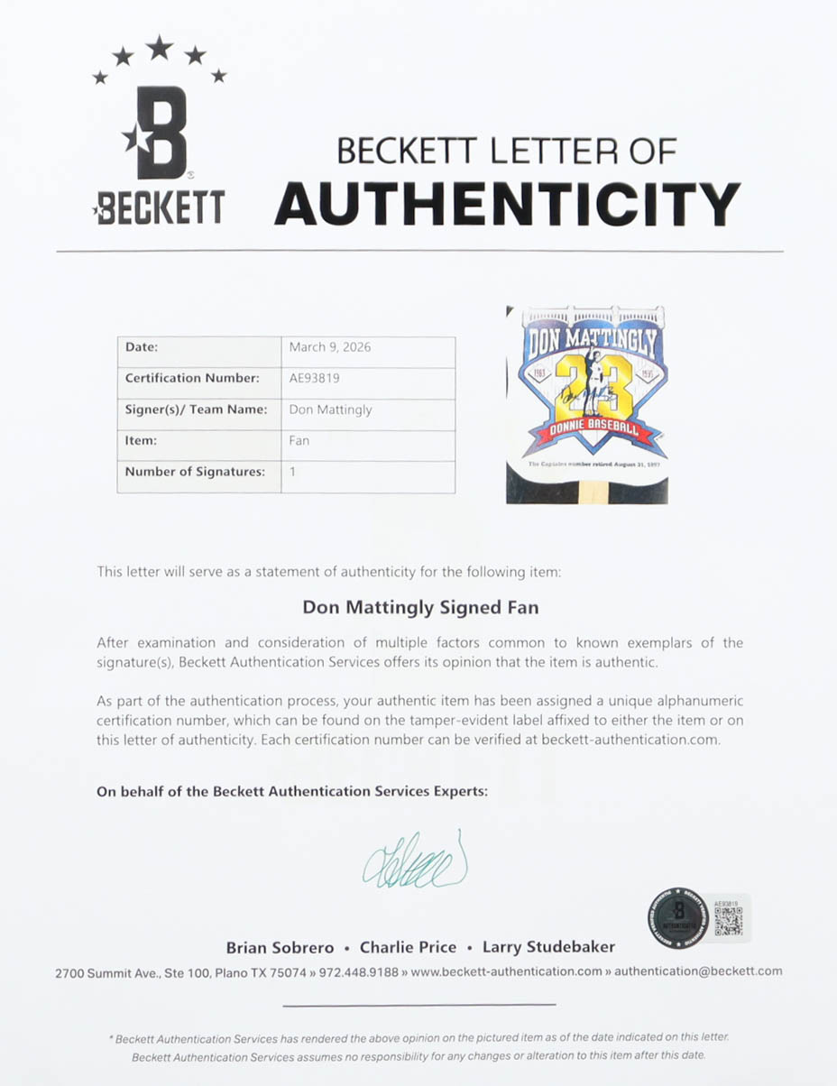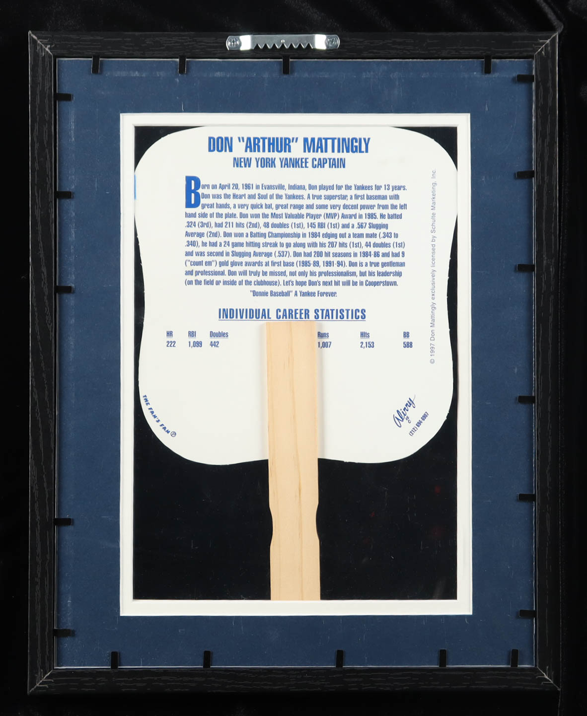 Custom framed display measures approximately 12" x 15" in size and features a "Donnie Baseball" commemorative fan that has been hand-signed by Don Mattingly (New York Yankees). Mattingly's career highlight statistics are featured on the reverse side of the fan.