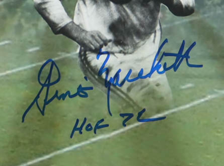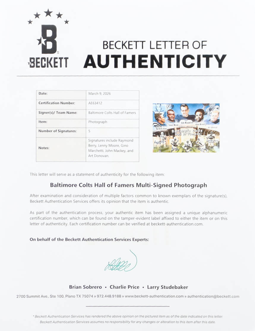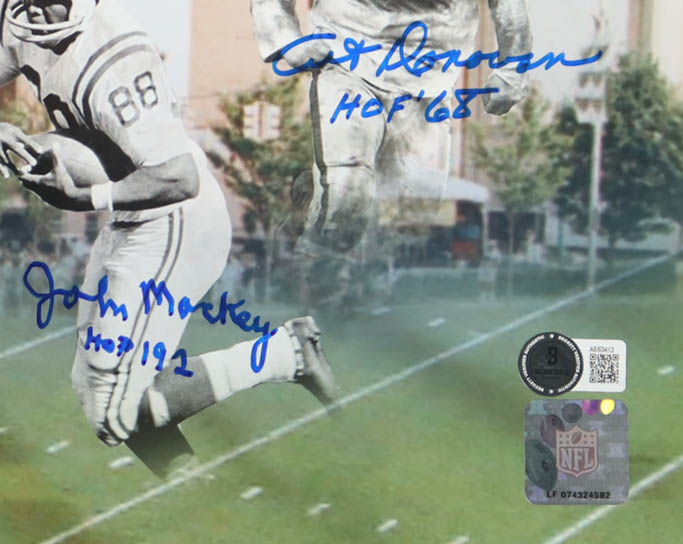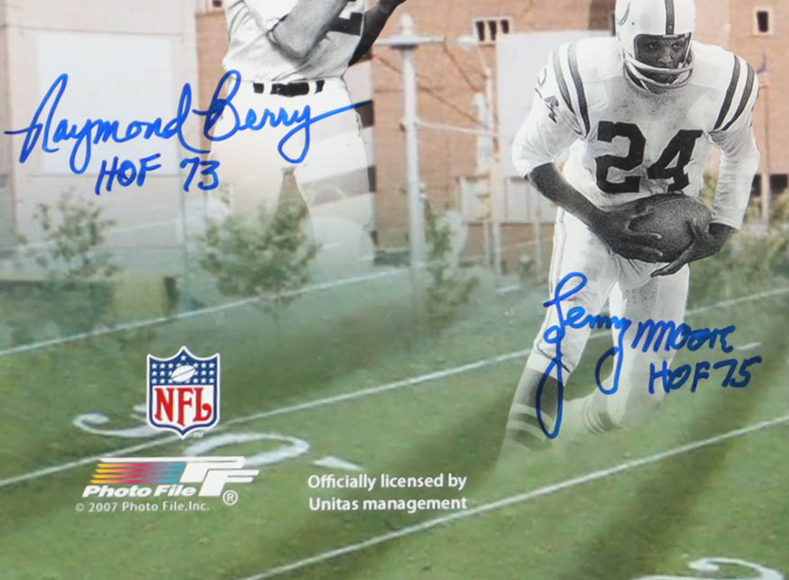 Photo measures approximately 16" x 20" in size and has been hand-signed and inscribed by Raymond Berry, Lenny Moore, Gino Marchetti, John Mackey, and Art Donovan.