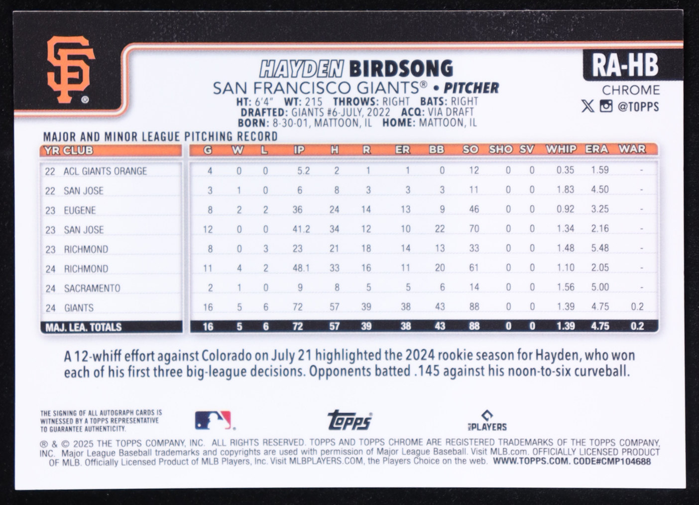 Hayden Birdsong 2025 Topps Chrome Rookie Autographs #RAHB RC