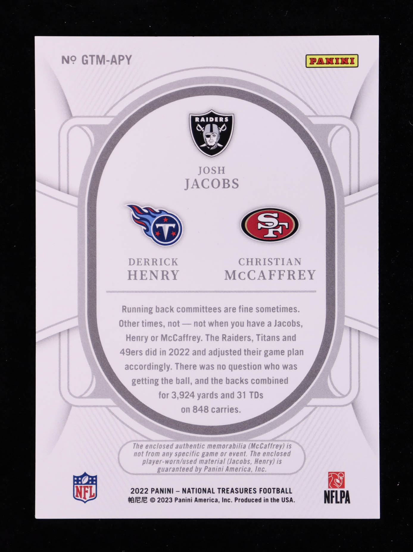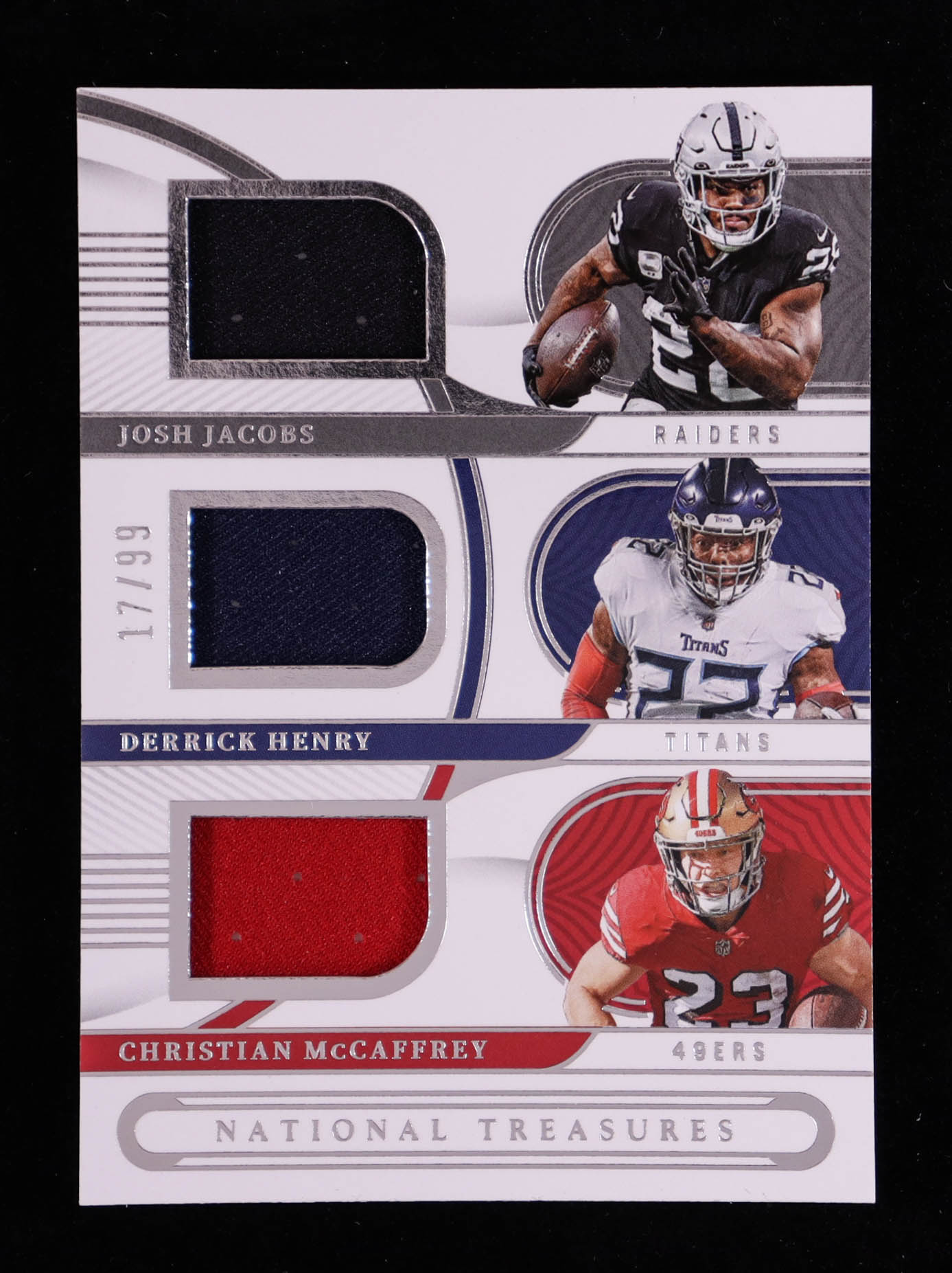 Josh Jacobs / Christian McCaffrey / Derrick Henry 2022 Panini National Treasures NFL Gear Trio Materials #14 #17/99