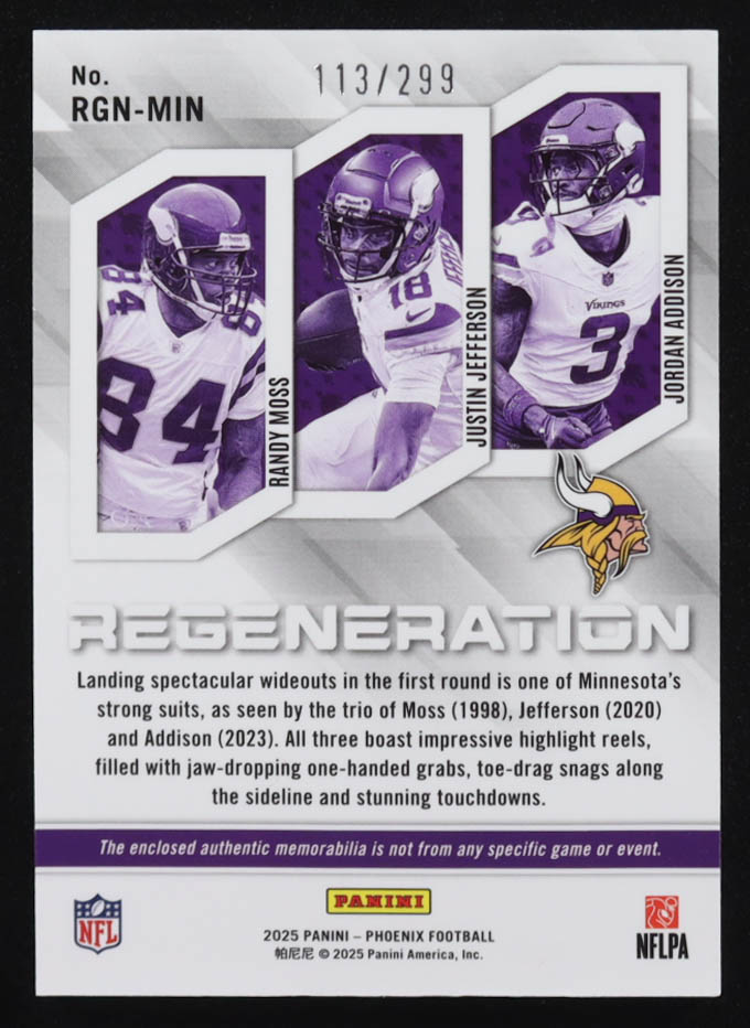 Randy Moss / Jordan Addison / Justin Jefferson 2025 Panini Phoenix Regeneration Jerseys #7 #113/299