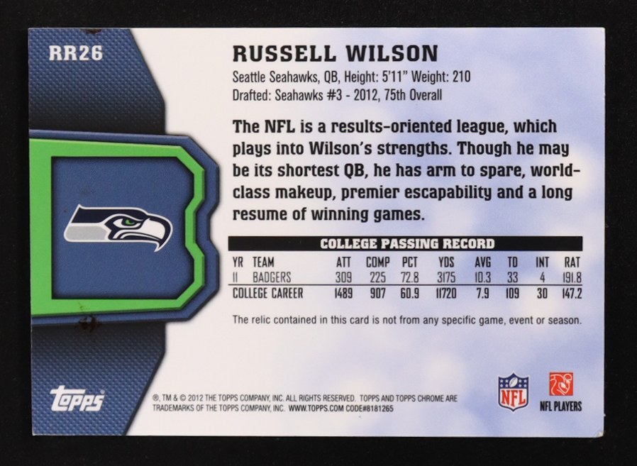 Russell Wilson 2012 Topps Chrome Rookie Relics #RR26 RC