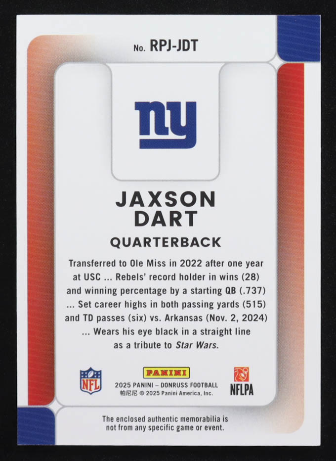 Jaxson Dart 2025 Donruss Rookie Phenom Jerseys #29 RC
