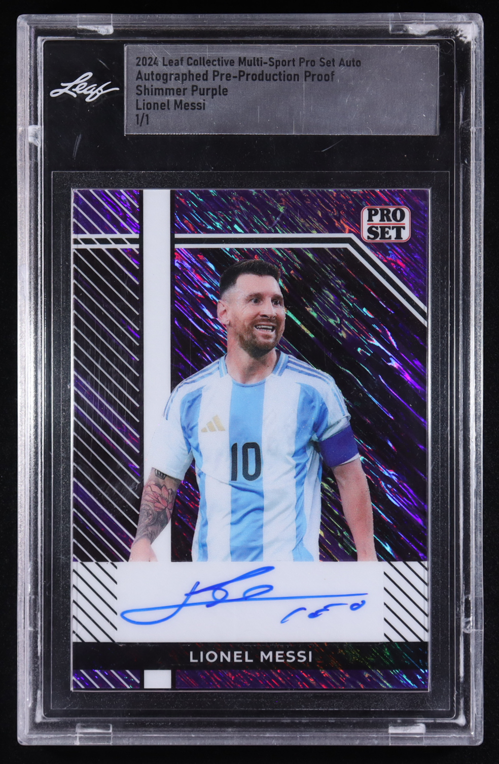 Lionel Messi 2024 Leaf Collective Multi-Sport Pro Set Auto Autographed Pre-Production Proof Shimmer Purple #NN #1/1 (Leaf)