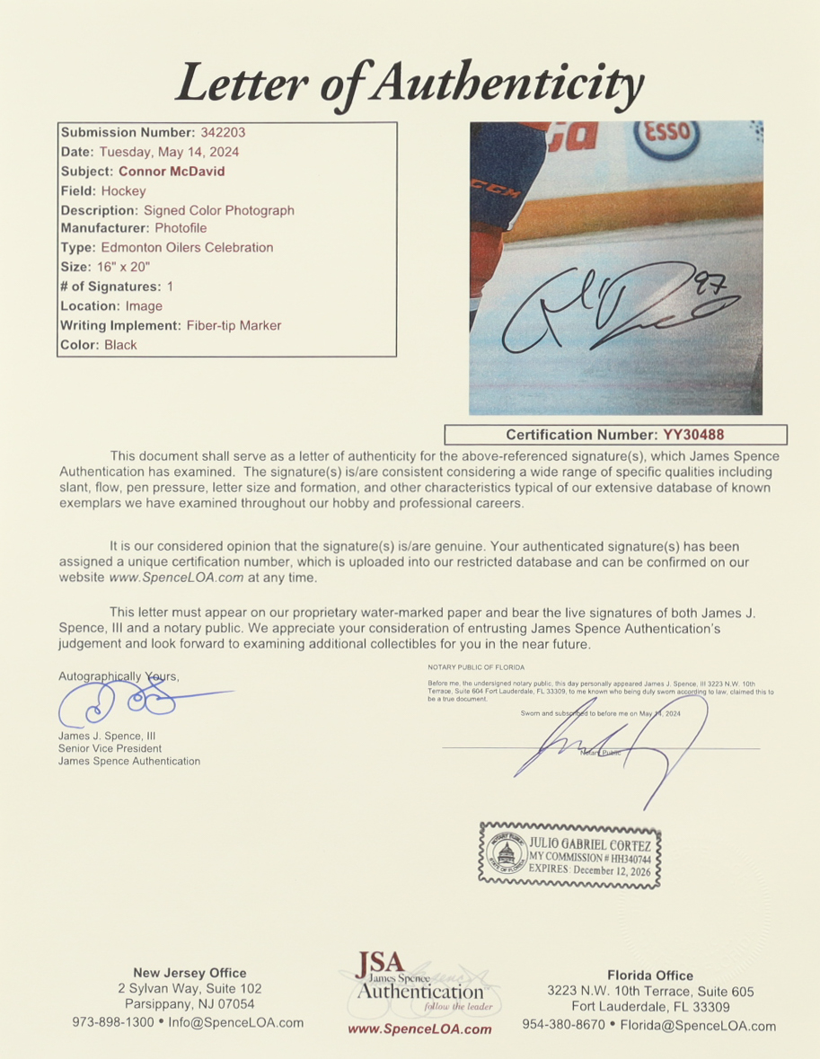 Photo measures 16" x 20" in size and has been hand-signed by Connor McDavid (Edmonton Oilers).