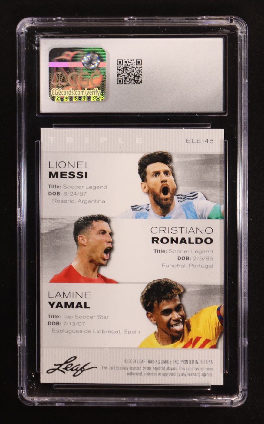 Lionel Messi / Cristiano Ronaldo / Lamine Yamal 2024 Leaf Special Release Exclusive Legends Edition #ELE45 (CGC 10)