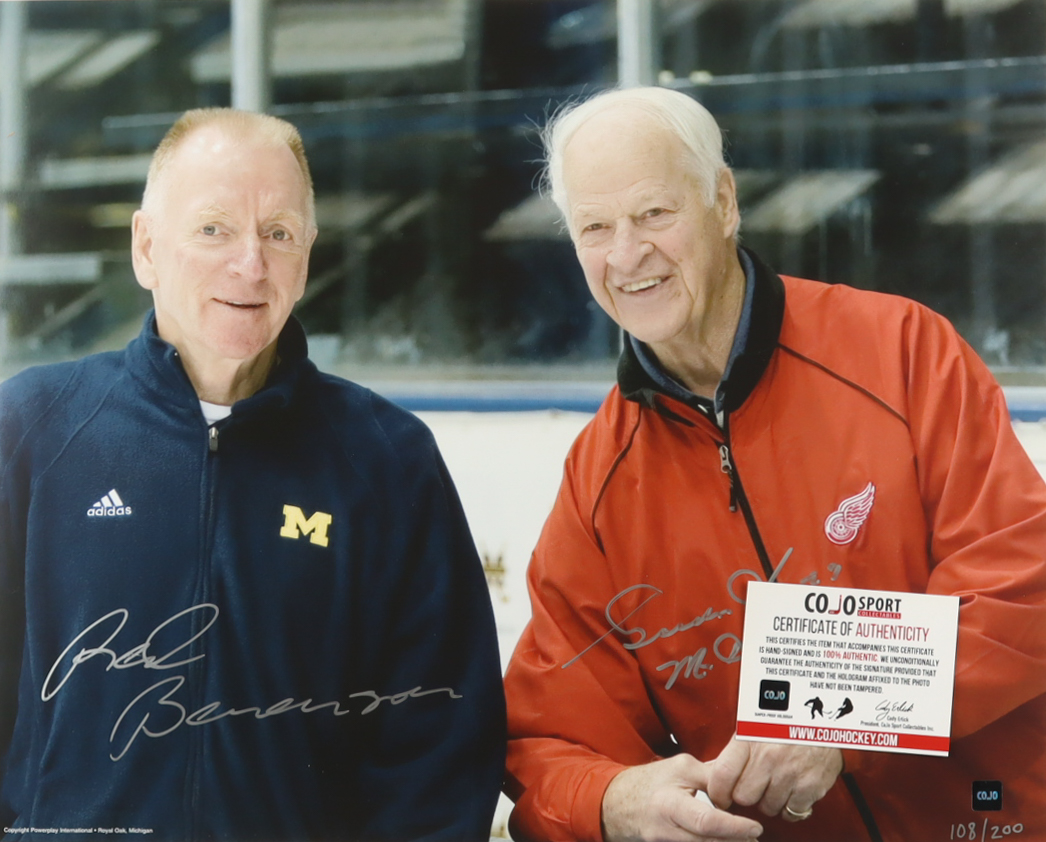 Photo measures 16" x 20" in size and has been hand-signed and inscribed by Red Berenson (Detroit Red Wings) and Gordie Howe (D. 2016, Detroit Red Wings, HOF). Photo is limited edition #108 / 200.