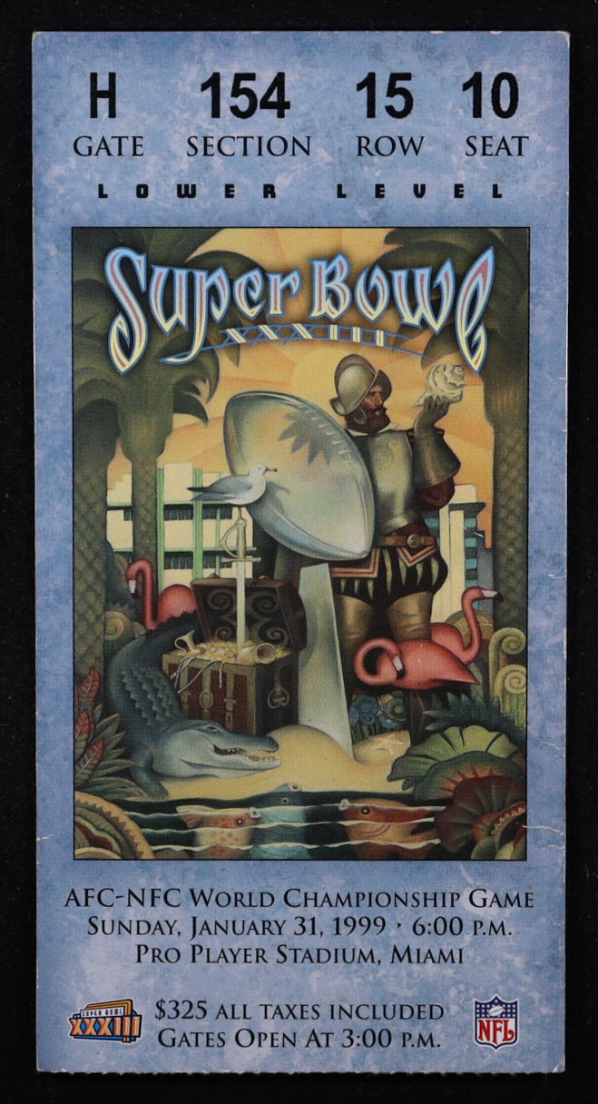 January 31, 1999 Original Super Bowl XXXIII Game ticket. Please see photos for details regarding the item. Note that the item is unsigned.