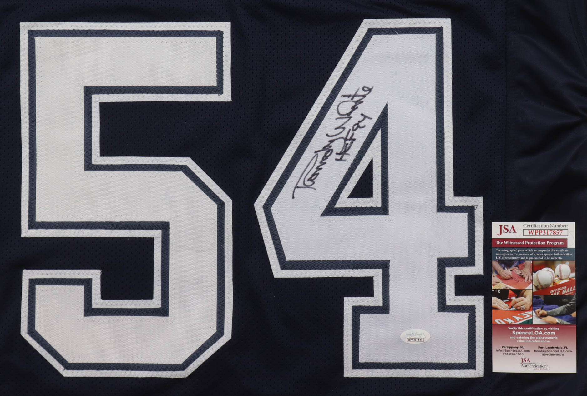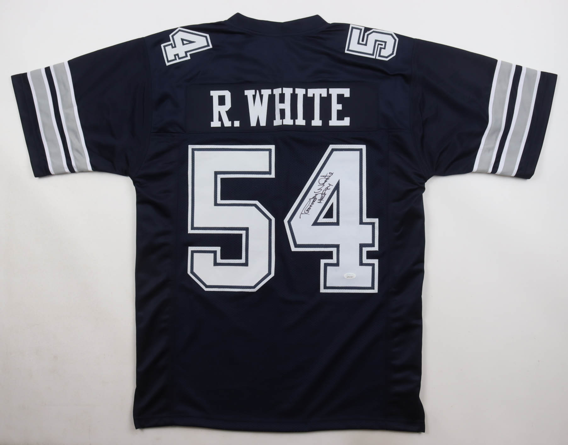 Custom jersey. Everything sewn on, size XL. Hand-signed and inscribed by Randy White (HOF). Please note, glue is visible through the reverse number.