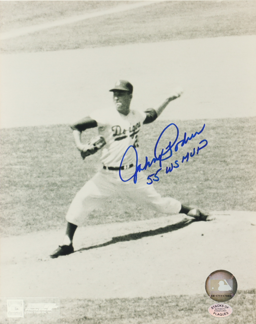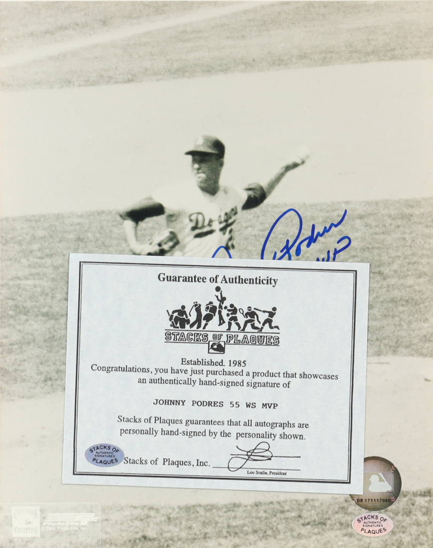 Photo measures 8" x 10" in size and has been hand-signed by Johnny Podres (D. 2008, Brooklyn Dodgers).