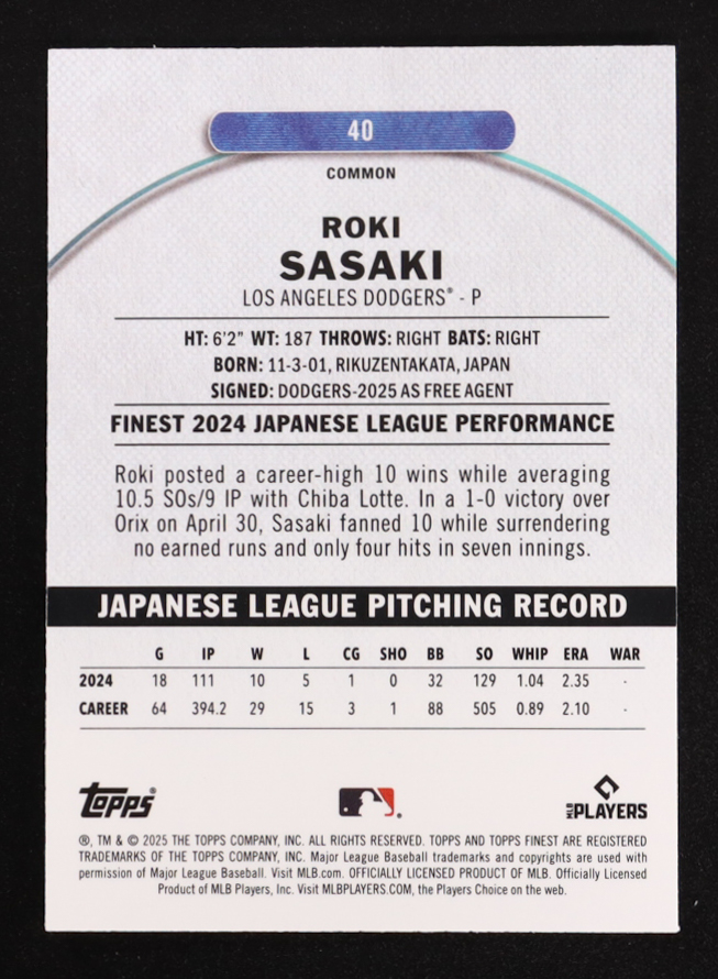 Roki Sasaki 2025 Finest Blue Refractors #40 #190/200 RC
