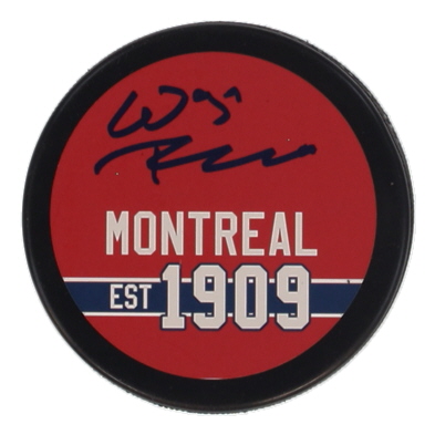 Montreal Canadiens logo hockey puck has been hand-signed by Wayne Thomas.