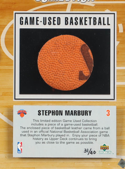 Custom frame measures approximately 13.5" x 16.5" in size and features a piece of a basketball used in-game by the New York Knicks, affixed to a photo of Stephon Marbury. The display is limited edition numbered #31/40. Please note, the display is unsigned.