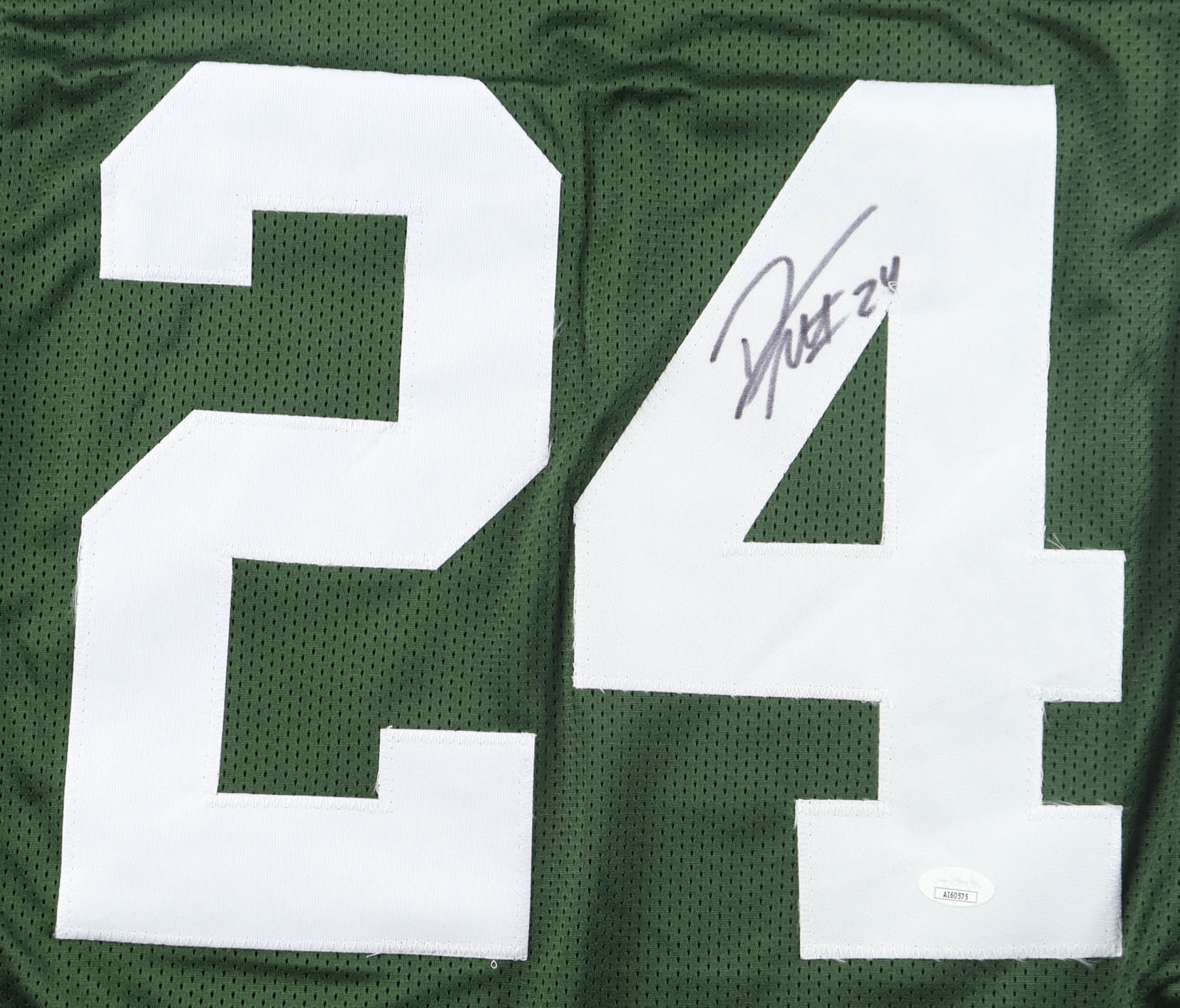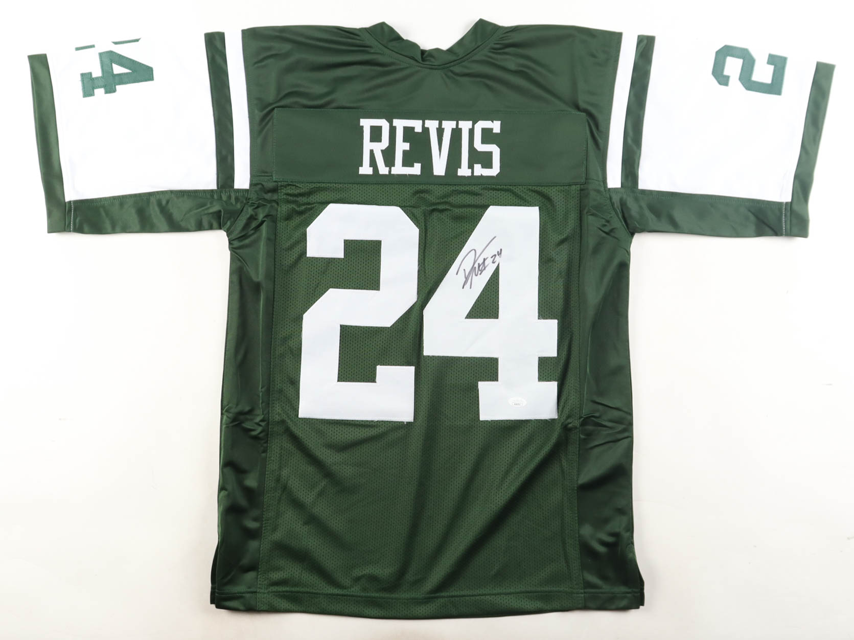 Custom jersey with everything sewn on, size XL. Hand-signed by Darrelle Revis (HOF).