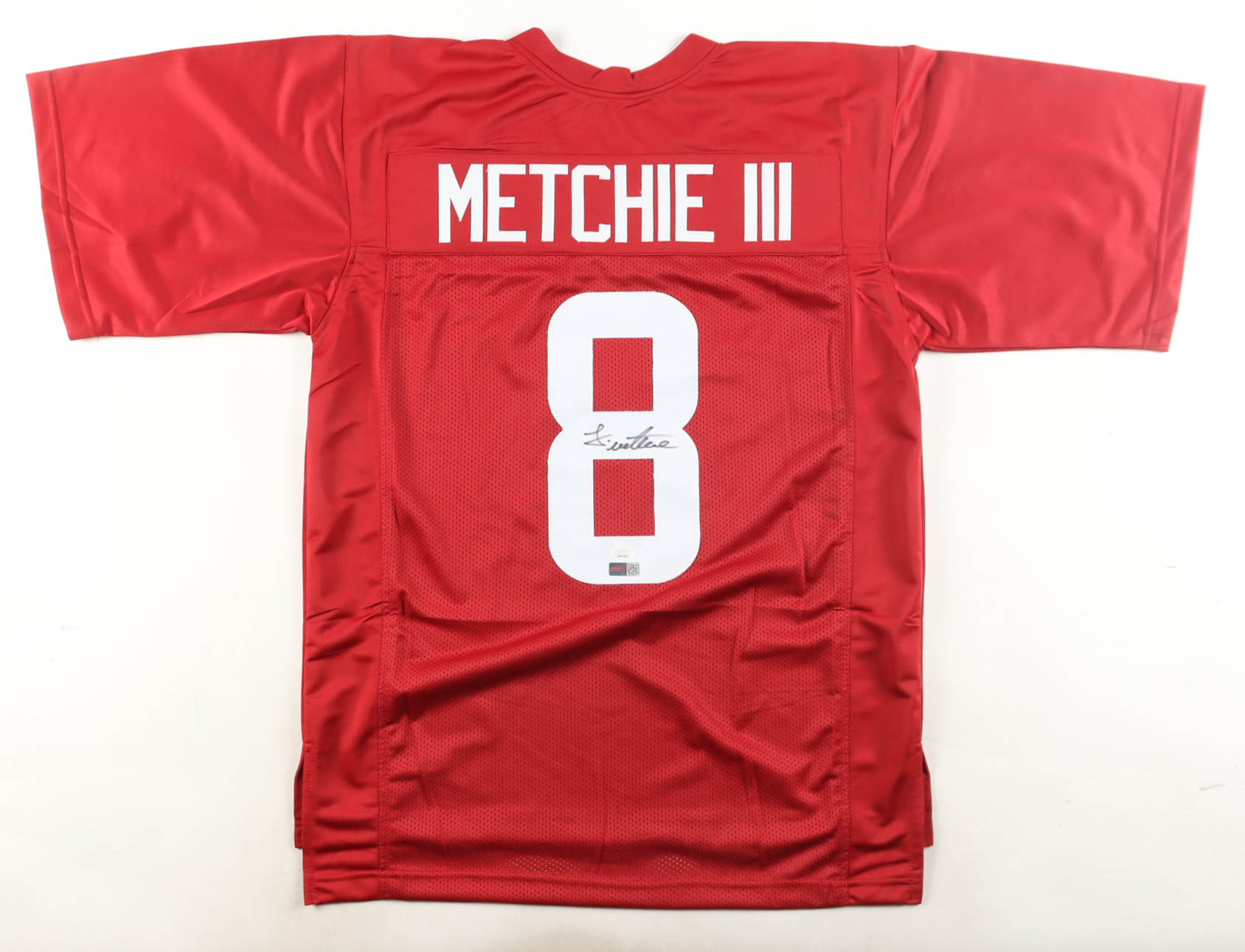 Custom jersey with everything sewn on, size XL. Hand-signed by John Metchie III.
