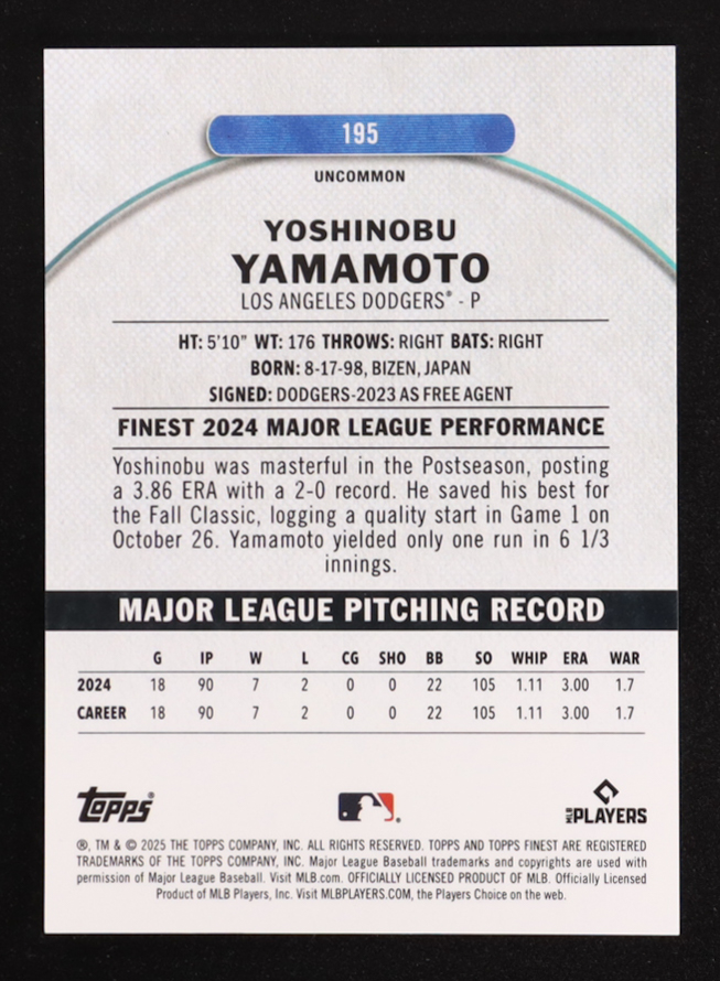 Yoshinobu Yamamoto 2025 Finest Green Refractors #195 #03/35