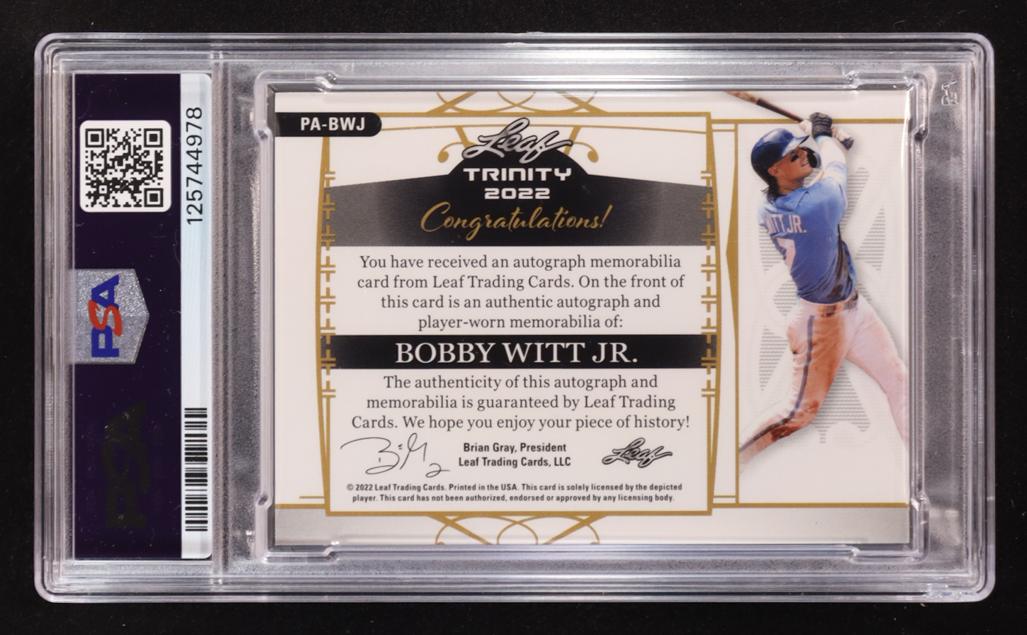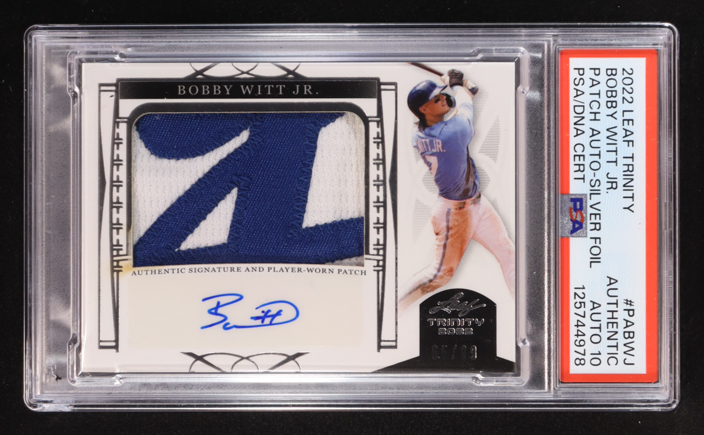 Bobby Witt Jr. 2022 Leaf Trinity Patch Autographs Silver Foil Player-Worn #PABWJ #65/99 RC (PSA Authentic | Autograph Graded 10)