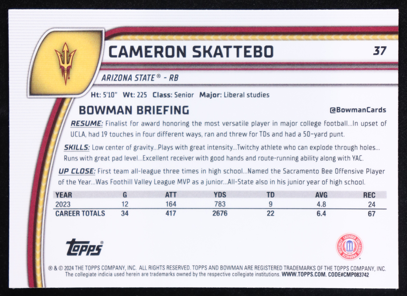 Cam Skattebo 2024 Bowman Chrome University #37 RC