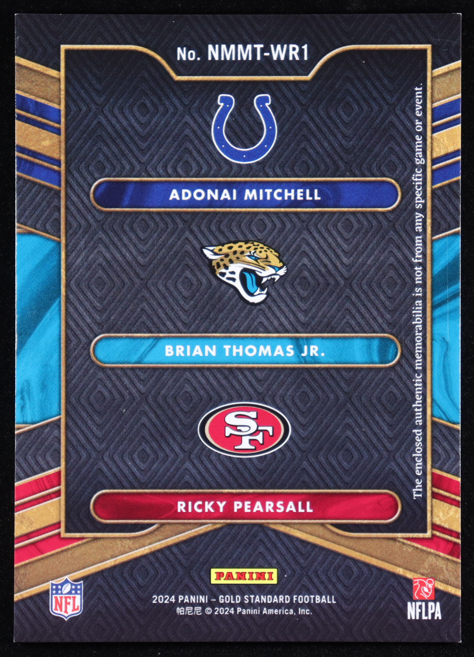 Brian Thomas Jr. / Ricky Pearsall / Adonai Mitchell 2024 Panini Gold Standard Newly Minted Memorabilia Triples #3 RC #29/99