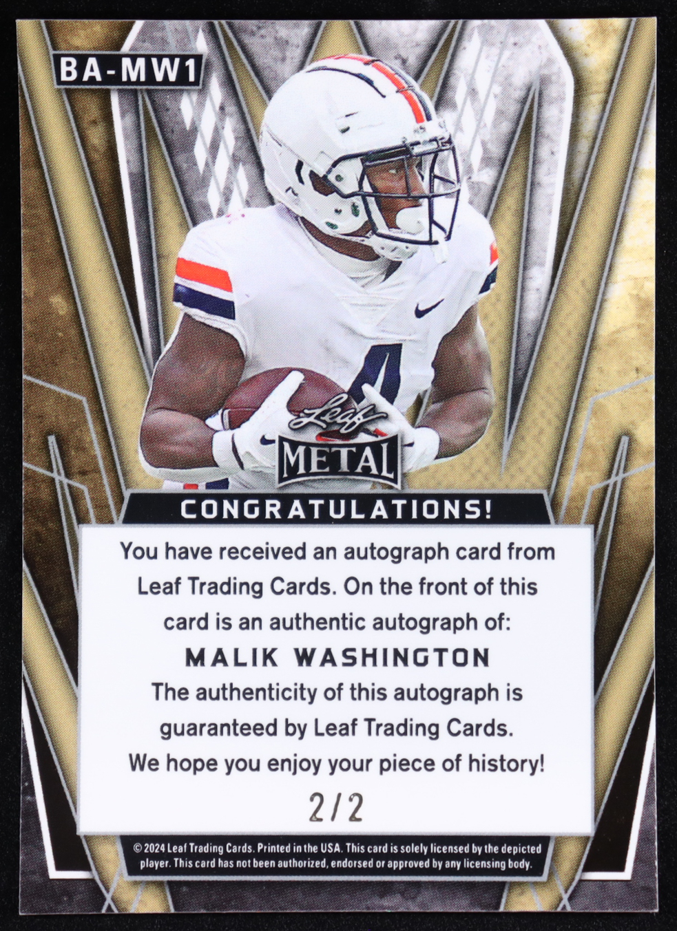 Malik Washington 2024 Leaf Metal Autographs Laser Black #BAMW1 #2/2 RC
