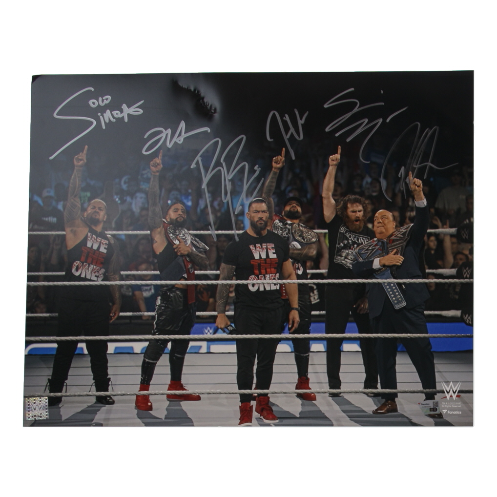 Photo measures 16" x 20" in size and has been hand-signed by Roman Reigns, Jey Uso, Jimmy Uso, Solo Sikoa, Paul Heyman and Sami Zayn. Please note there is denting and creasing on the photograph.