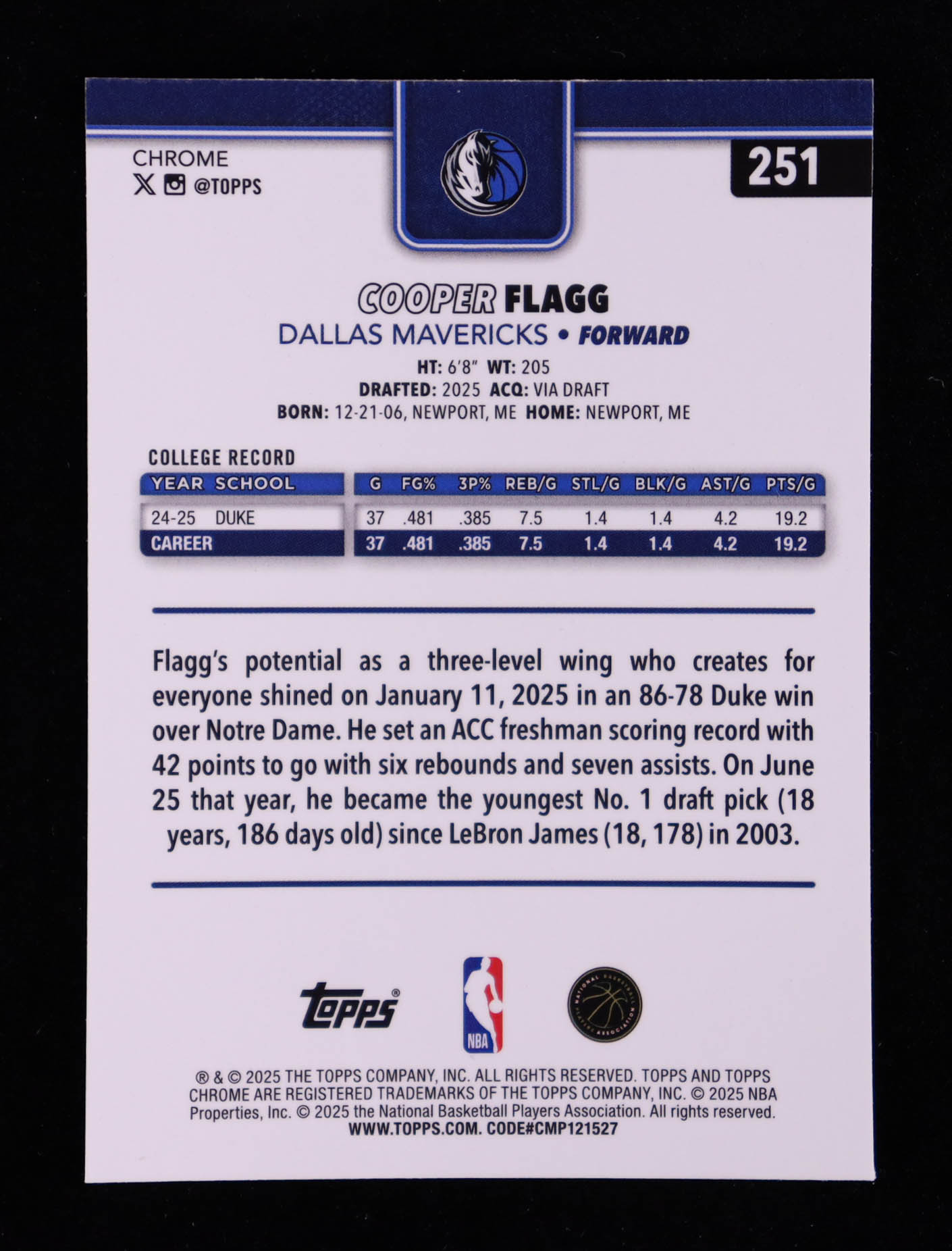 Cooper Flagg 2025-26 Topps Chrome #251 RC