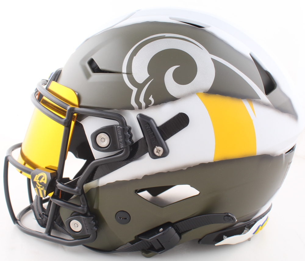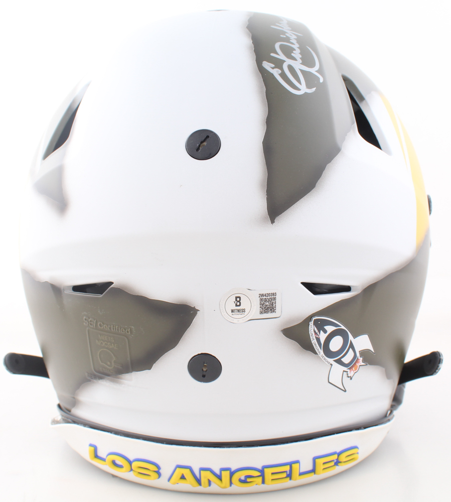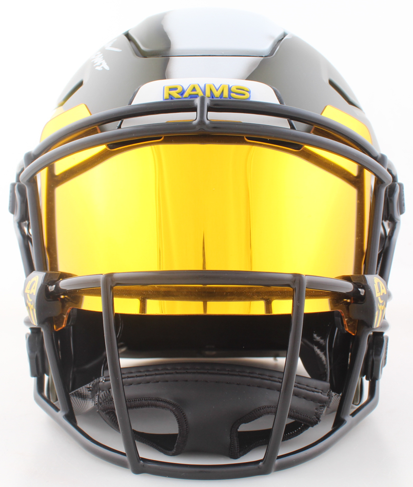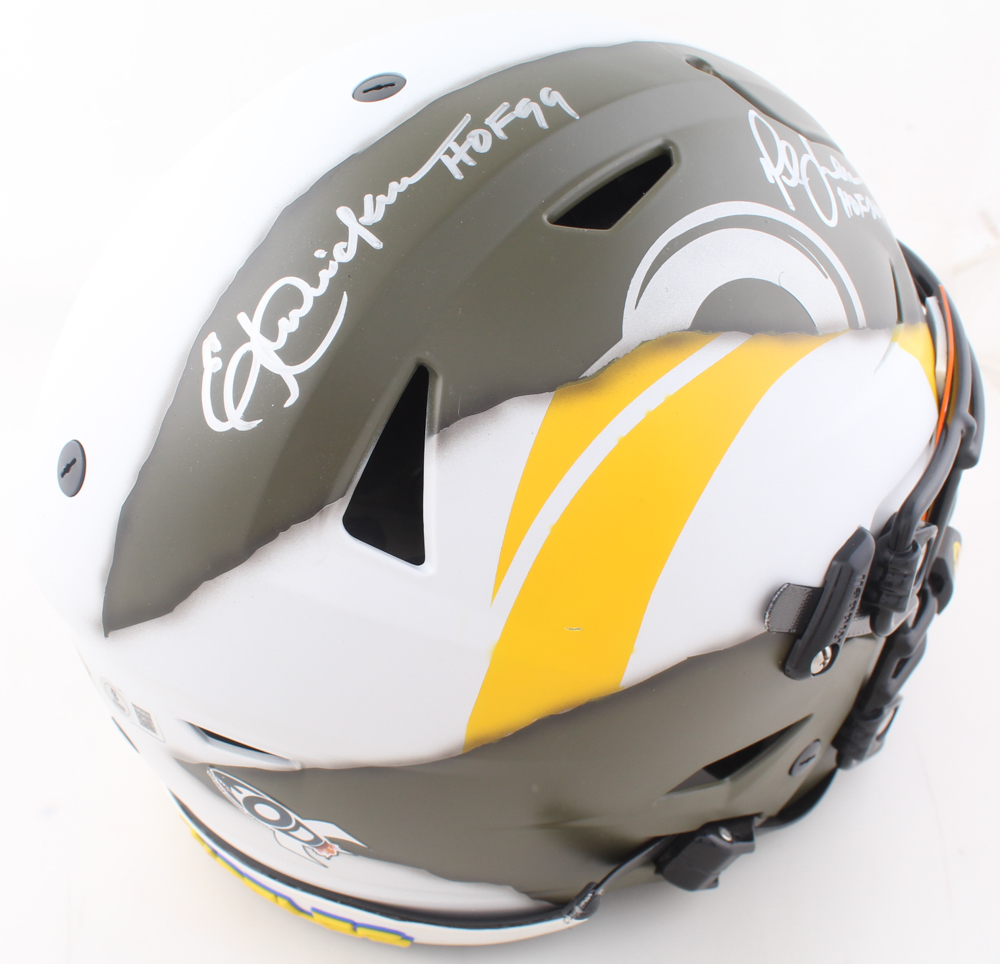 Riddell Los Angeles Rams Throwback Full-Size Custom On-Field Speedflex Helmet with a visor has been hand-signed and inscribed by Eric Dickerson (HOF) and Marshall Faulk (HOF).