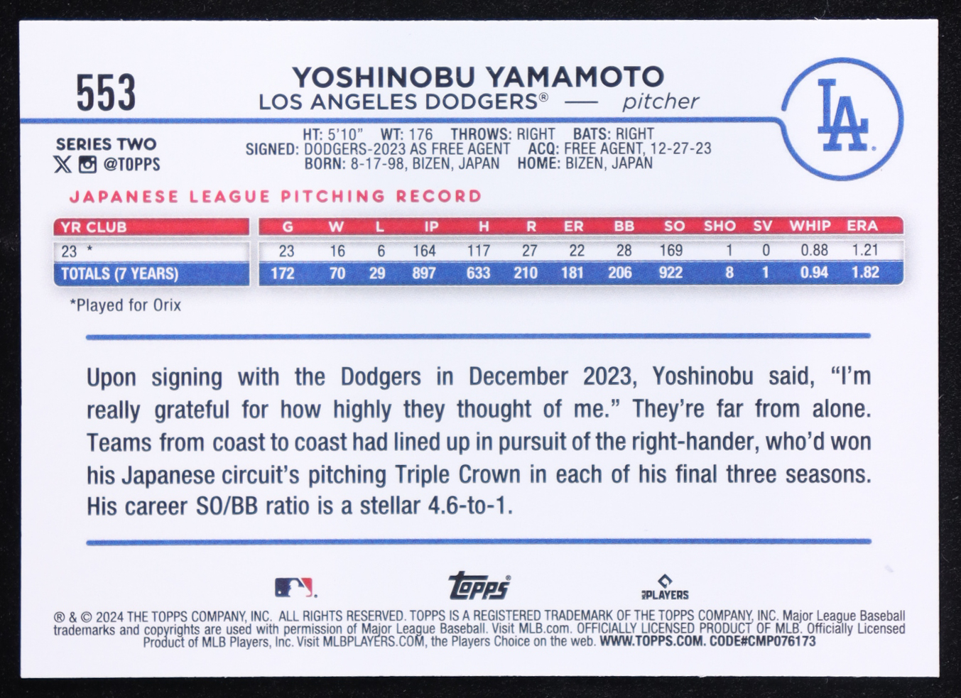 Yoshinobu Yamamoto 2024 Topps #553 RC