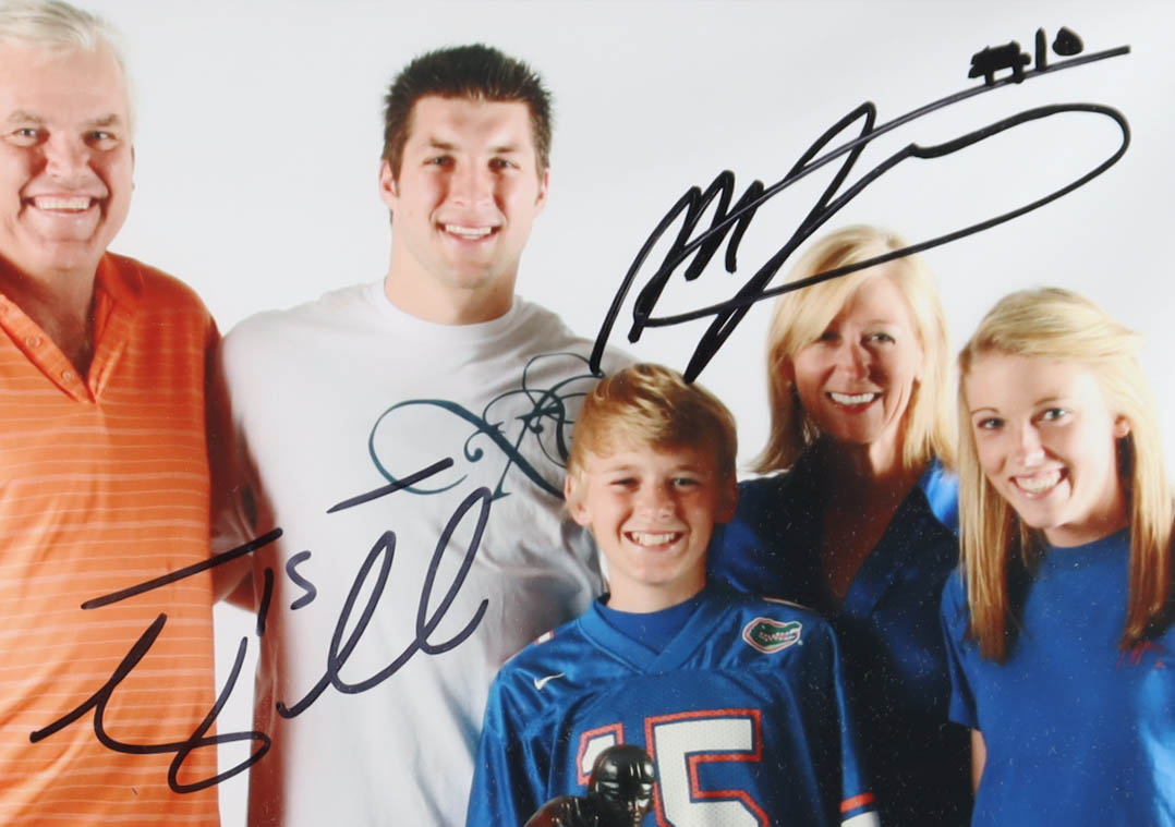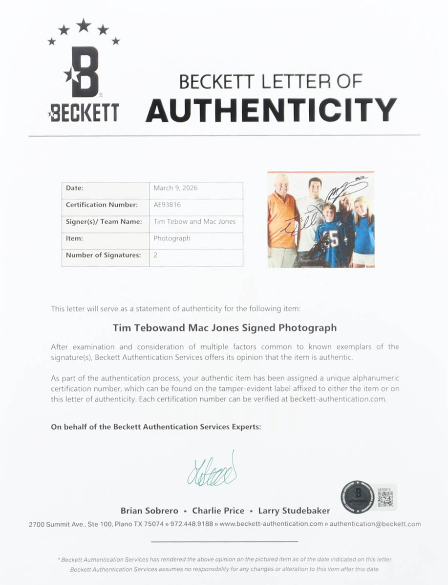Custom frame measures approximately 19" x 22" in size. Photo is hand-signed by Tim Tebow (Denver Broncos) and Mac Jones (San Francisco 49ers). See photos for more details.