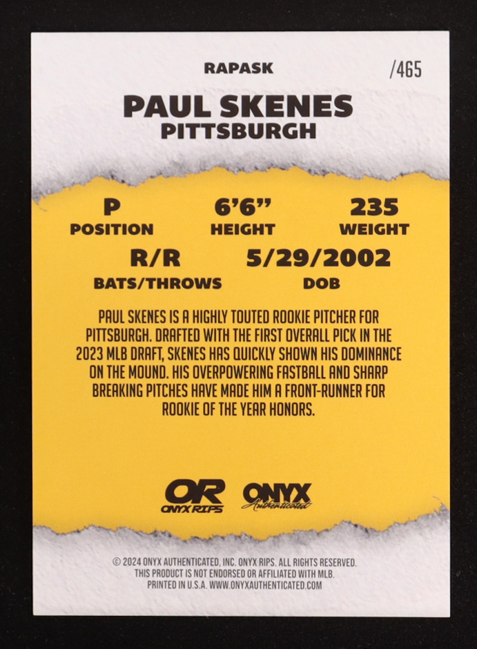 Paul Skenes 2024 Onyx Rips Autographs Crystal Yellow #RAPASK RC