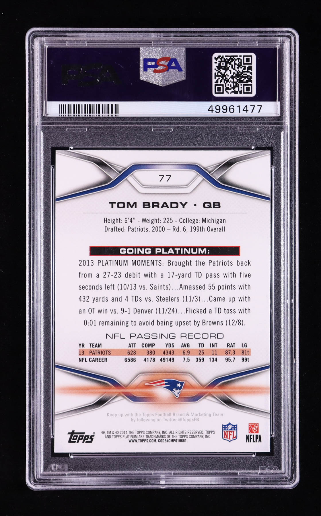 Tom Brady 2014 Topps Platinum Blue Wave Refractors #77 (PSA 9)
