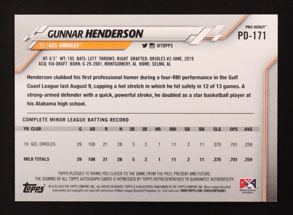 Gunnar Henderson 2020 Topps Pro Debut Autographs #PD171 RC