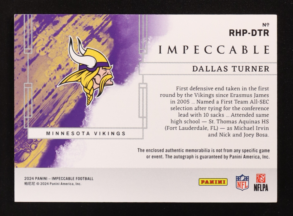 Dallas Turner 2024 Panini Impeccable Elegance Rookie Helmet and Patch Autographs #23 RC #1/75